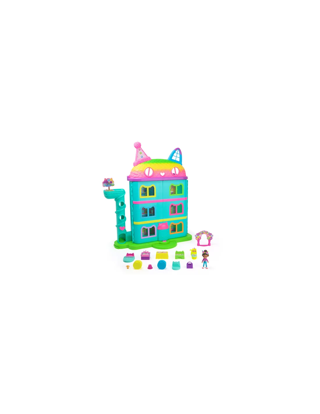 Gabby's Dollhouse , Casa delle bambole per festeggiamenti da 14 pezzi a tema arcobaleno, personaggi giocattolo, mobili per la ca