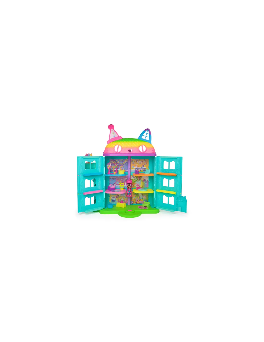 Esplora l'incantevole ambientazione della Casa delle bambole per festeggiamenti di Gabby, un capolavoro a tema arcobaleno alto 60 cm. Scatena la creatività con il personaggio giocattolo di Gabby di 8,8 cm, i mobili della casa delle bambole e 10 accessori, come un gabinetto a forma di gattino, un pianoforte e console da DJ e tanto altro. Senti il ritmo alla console da DJ e utilizza il Gat-ascensore per accedere a sei stanze e a un'area giochi sul tetto. Metti le scatole nella torre e premi il pulsante per scoprire tesori segreti, poi apri la casa delle bambole per ascoltare 6 effetti sonori della serie. I giocattoli Gabby’s Dollhouse per bambini e bambine sono degli ottimi regali per i fan della serie Netflix di successo e per chi adora costruire ambientazioni di fantasia con le case delle bambole. Rendi indimenticabile la loro prima casa delle bambole con tantissimi adorabili personaggi giocattolo, accessori e mobili da collezionare e sistemare all'interno. Costruisci il tuo universo di gioco con i kit essenziali per la casa, come una cucina o una stanza della musica, e tanti oggetti da collezionare, come una strepitosa nave da crociera giocattolo, una piscina a tema sirena e il set di gioco Salone per feste (una soffitta della casa delle bambole con pista di pattinaggio al coperto), nonché i graziosi balconi della casa delle bambole con mini giocattoli tattili, che offrono un'esperienza sensoriale soddisfacente e si integrano con entrambe le versioni della casa delle bambole.