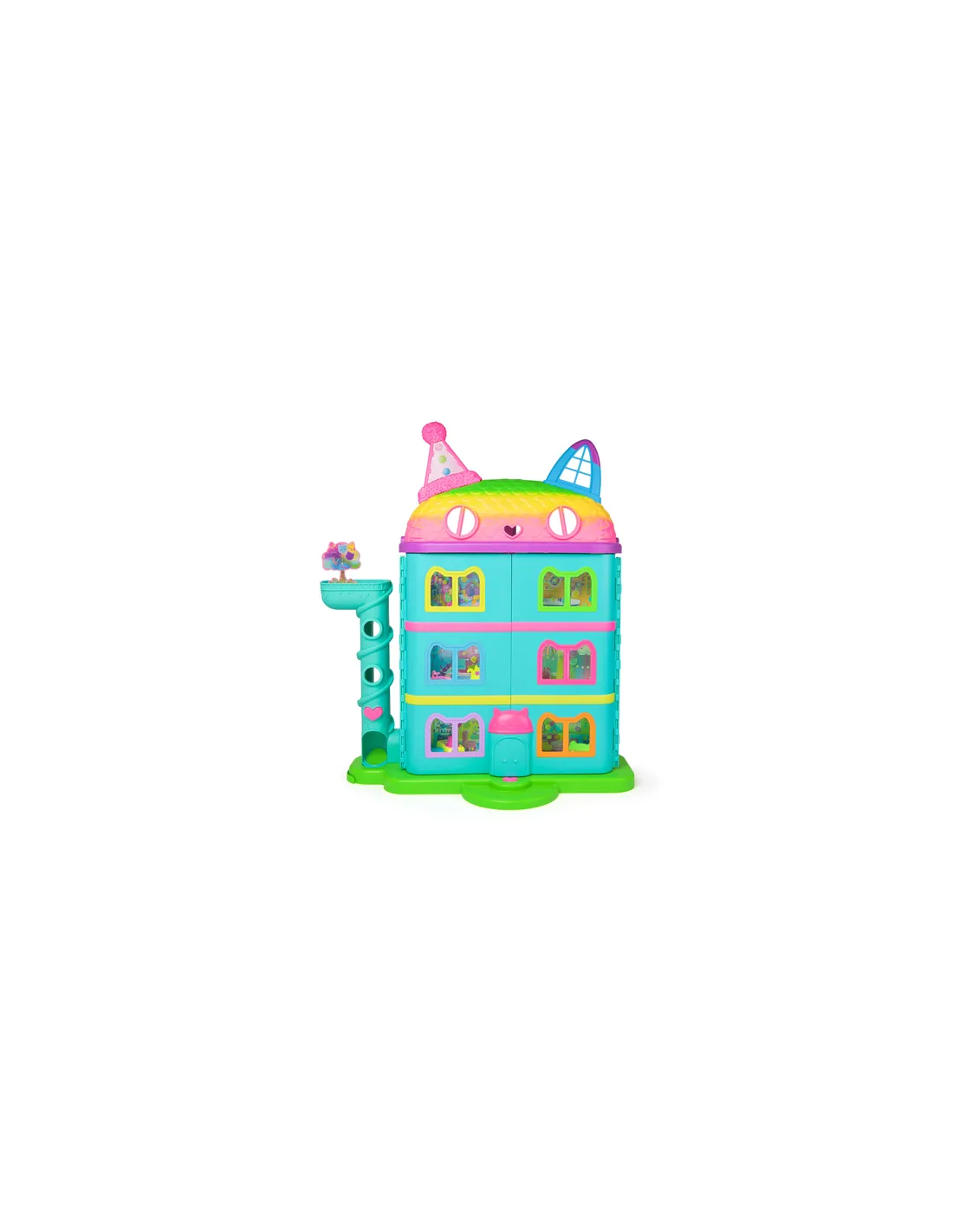 Esplora l'incantevole mondo della Gabby's Celebration Dollhouse, un capolavoro a tema arcobaleno alto più di 60 cm! Scatena la creatività con il personaggio giocattolo Gabby Girl da 9 cm, i mobili della casa delle bambole e 10 accessori, come un water a tema gattino, un pianoforte/tavolo da DJ e molto altro! Balla sul tavolo da DJ e usa il Cat-A-Vator per accedere a sei stanze e ad un'area giochi sul tetto. Lascia i pacchi nella torre delle consegne e premi il pulsante per scoprire tesori segreti, quindi apri la casa delle bambole per ascoltare 10 effetti sonori dello spettacolo. I giocattoli Gabby's Dollhouse per bambine e bambini sono fantastici regali per chi è fan della serie di successo di Netflix ed amano costruire mondi di case delle bambole di finzione.