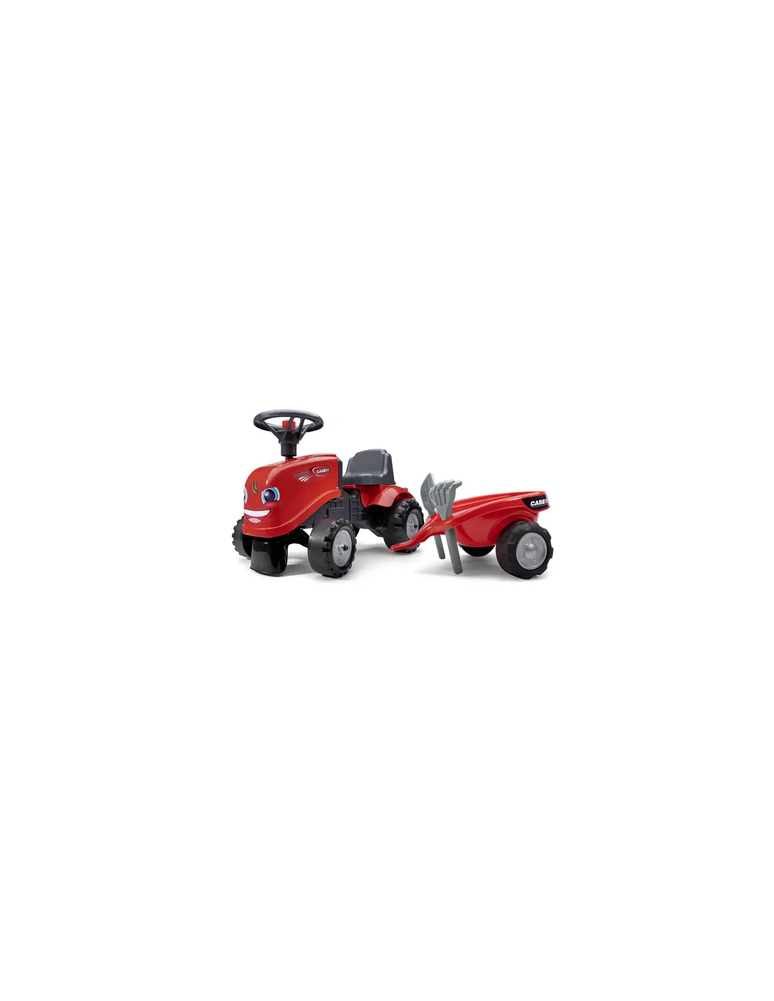 Trattore realizzato in plastica resistente, ma leggera; progettato per i bambini che possono già sedersi, sviluppa le attività motorie, l'equilibrio e il senso della direzione. Adatto per interno e per esterno: nel suo rimorchio i bimbi potranno trasportare piccoli oggetti. Dotato di clacson sul volante, completo di 2 serie di decalcomanie per personalizzare al meglio il proprio gioco. Prodotto made in France, su licenza ufficiale Case IH.