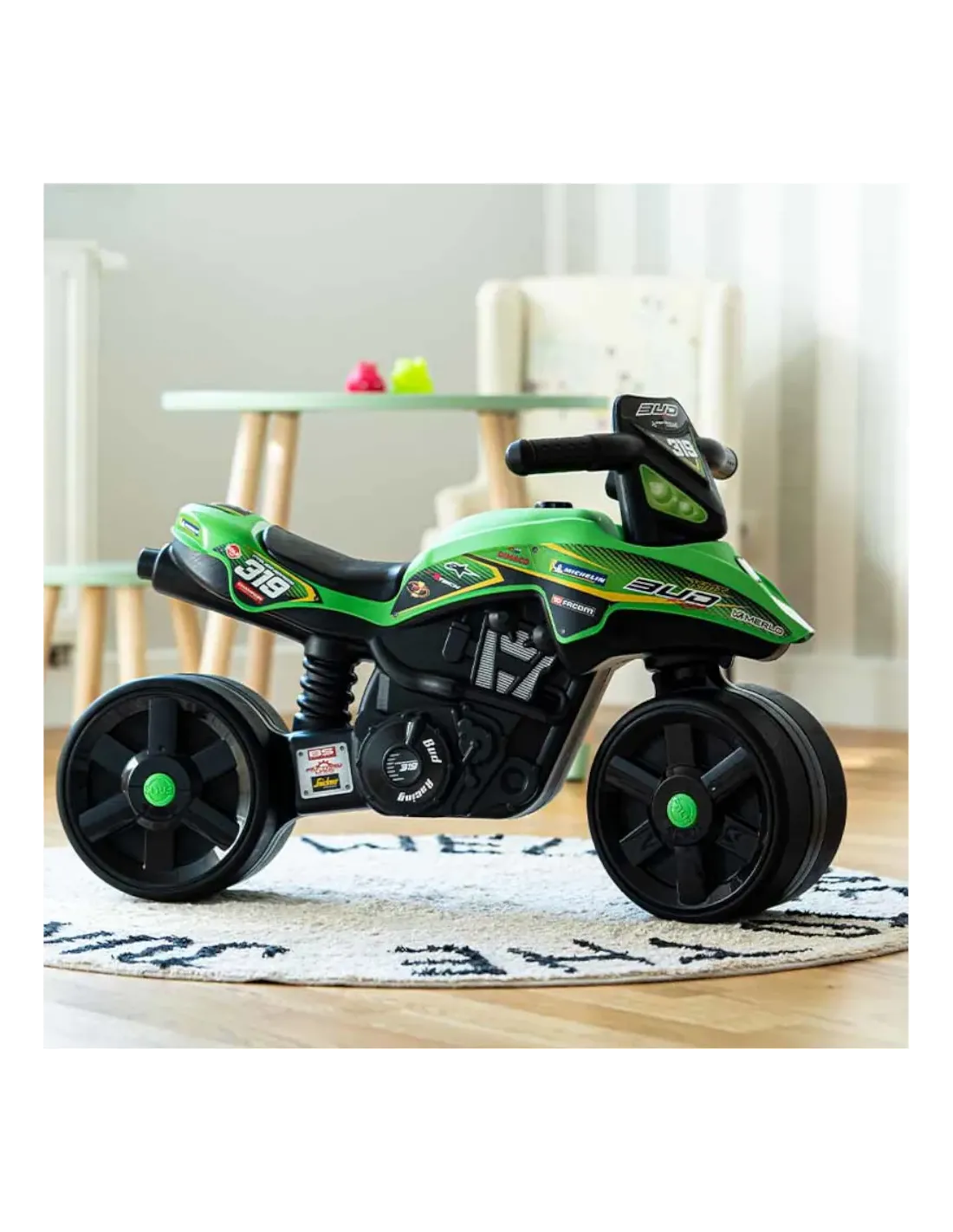 Volante dotato di clacson a soffietto, comoda maniglia, sedile con sagome e figure da inserire, gioco educativo, vano portaoggetti sottosella e scatola litografata. Fai salire in sella il tuo bambino, sarà una gioia per lui muovere i primi passi su questo mezzo/giocattolo, Saetta lo accompagnerà nei suoi primi momenti divertenti.