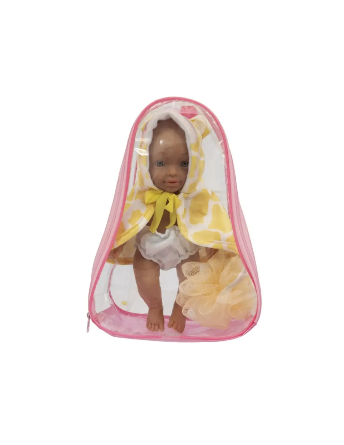 Morbido e dolce bambolotto alto 45 cm per teneri abbracci. Prenditi cura di lui dandogli la pappa o facendolo bere dal biberon, cantagli la ninnananna mentre si addormenta sul suo cuscino, gioca con lui e la sua paperella. Indossa una graziosa tutina con sopra ricamata una giraffa e un cappellino.