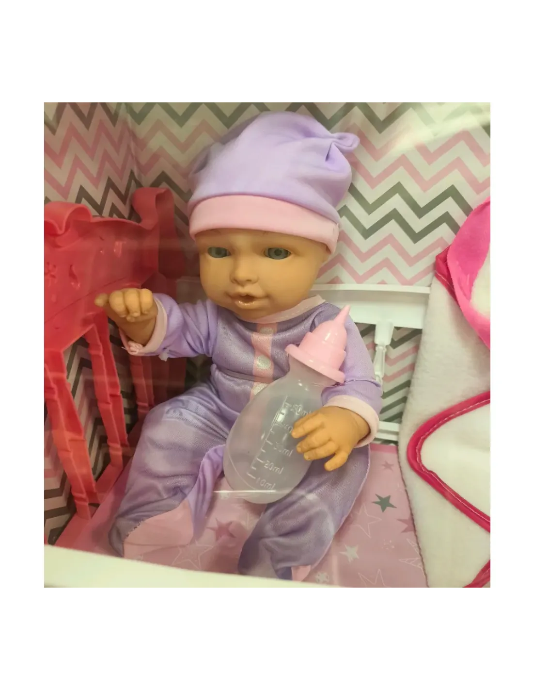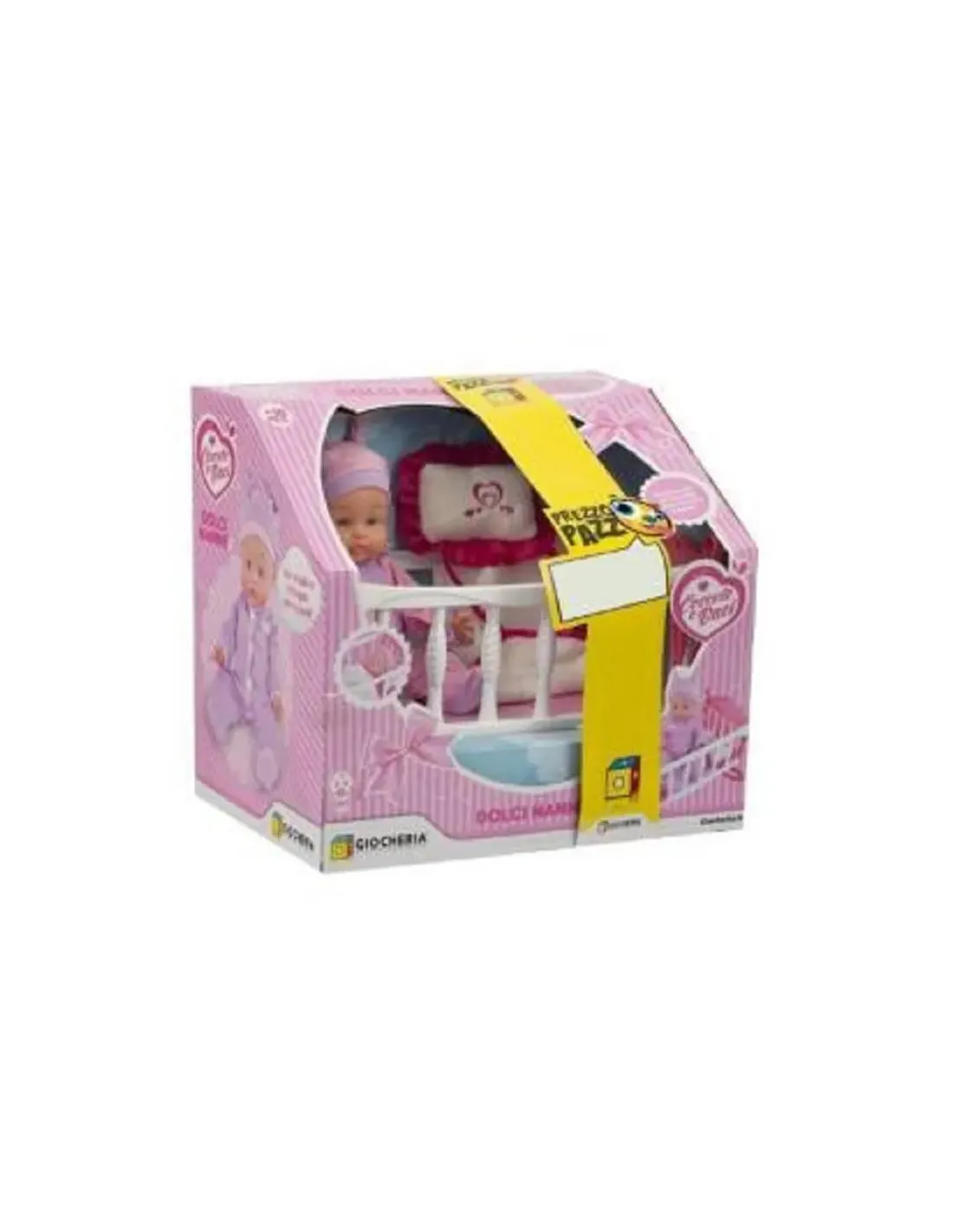 Dolce bambolotto profumato, con il suo pigiamino e la copertina con le orecchie da coniglietto dal colore rosa; l'altezza del bebè è di 33cm.. Arias è da sempre la bambola che più assomiglia ad un vero bebè, in questa confezione l'eleganza del prodotto non ha eguali; ad impreziosire ulteriormente il giocattolo c'è anche un ciuccio.