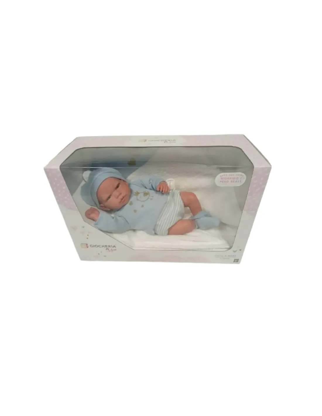 Bambola 40 cm con pigiamino azzurro e bianco e copertina abbinata.
