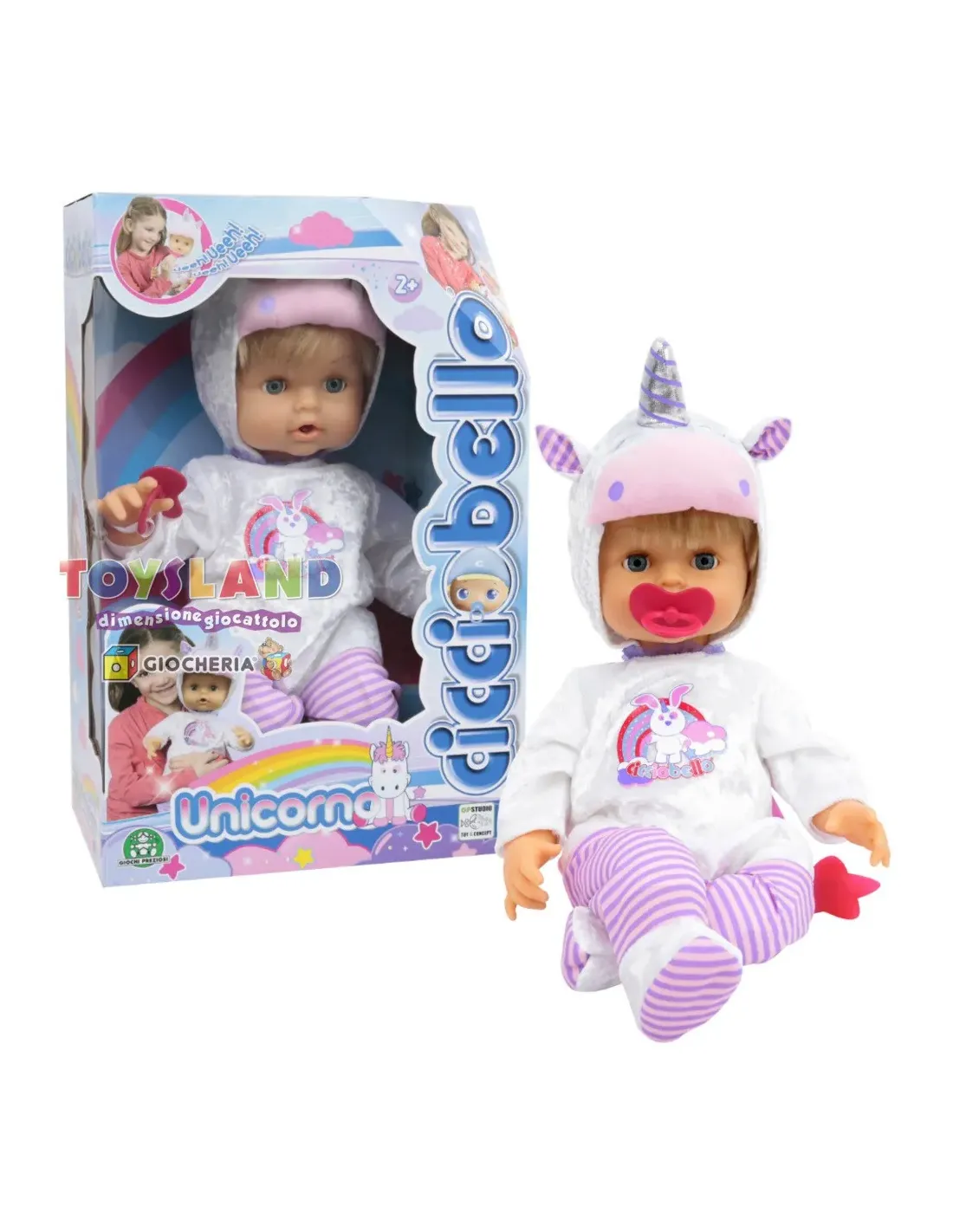 Simpatica versione dell'intramontabile Cicciobello, il bambolotto più amato di tutti i tempi; piange come un normale Cicciobello anche se vestito come un magico e fantasioso unicorno.. leggendaria creatura del mondo delle fiabe.