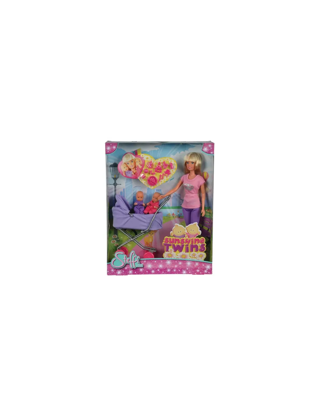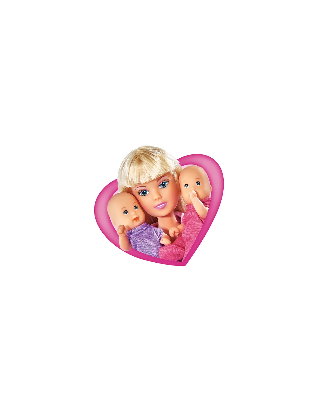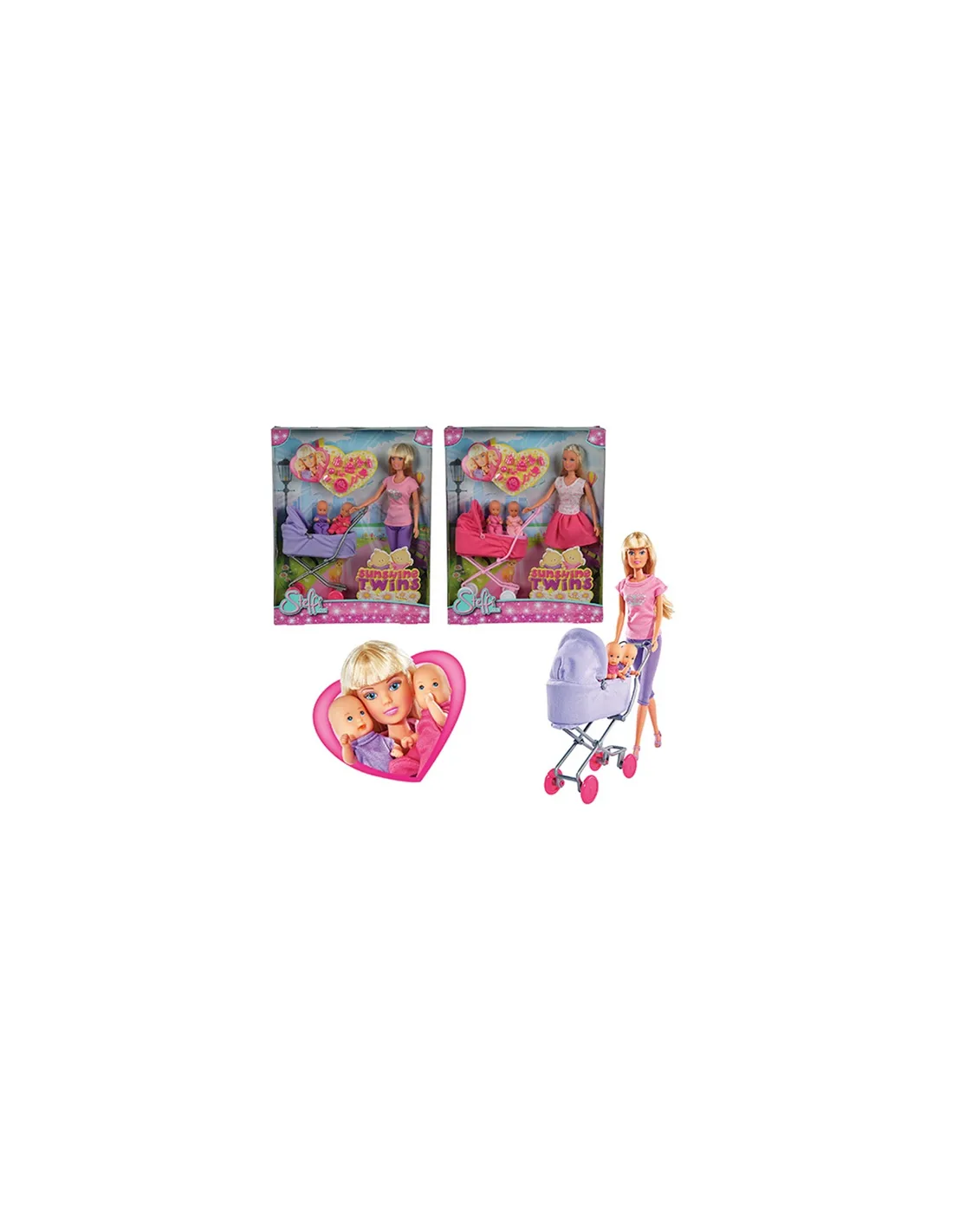 La famiglia di Steffi in una confezione particolare; lei è vestita con un grazioso vestitino a fiorellini, i capelli lunghi e biondi sono raccolti in un adorabile acconciatura. E poi ci sono loro: i piccolini, la femminuccia simile alla mamma indossa un vestito a fiori mentre il maschietto ha una t-shirt in tinta azzurra, proprio come il papà.