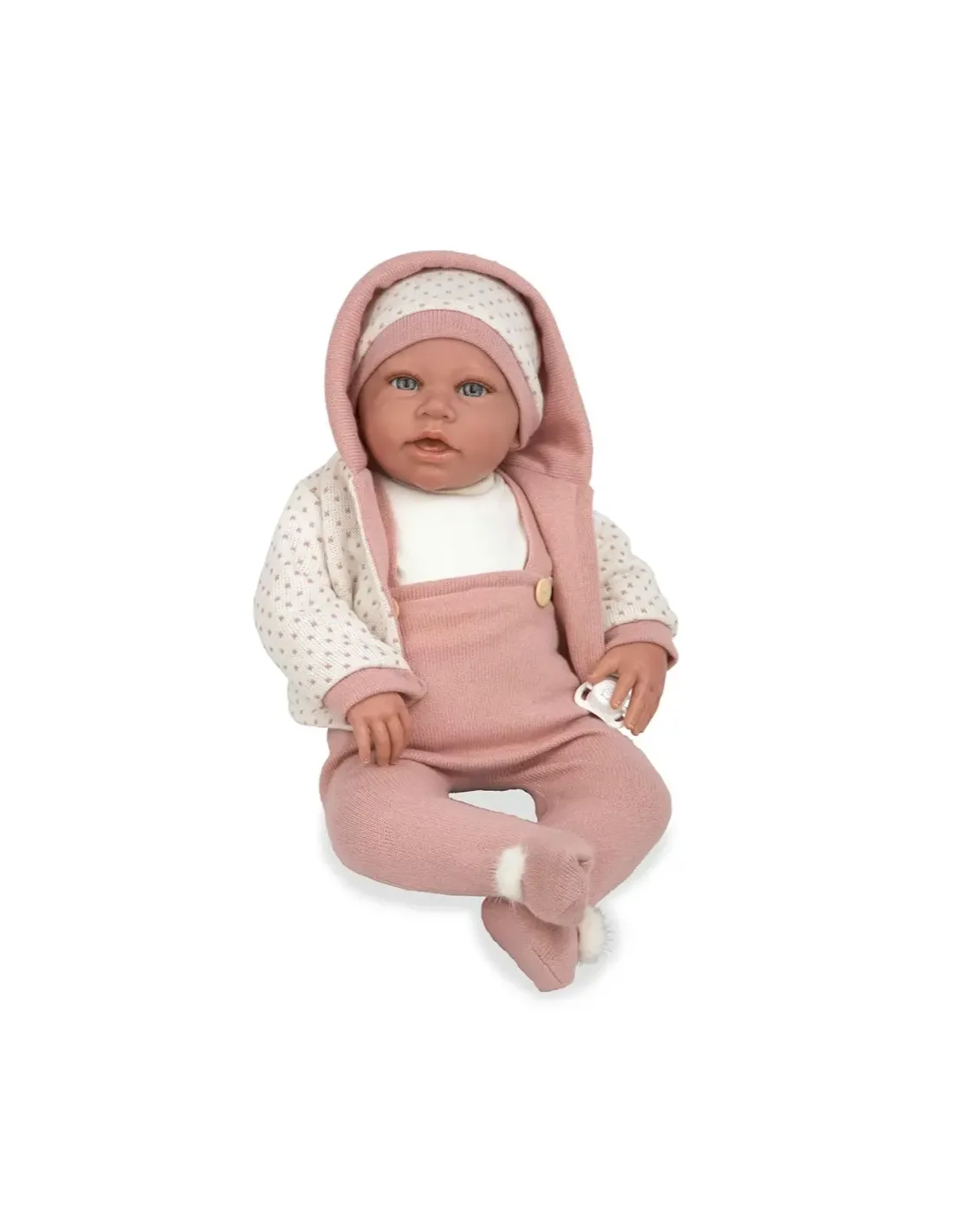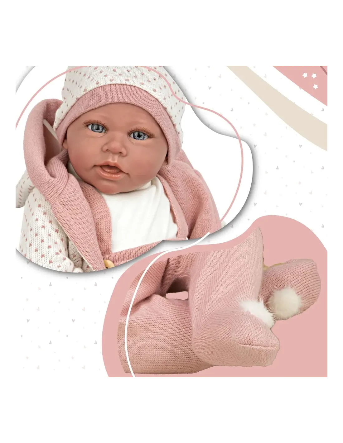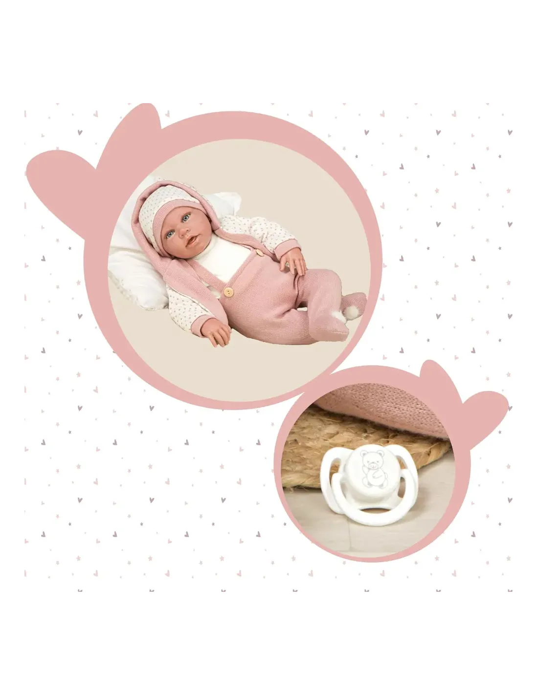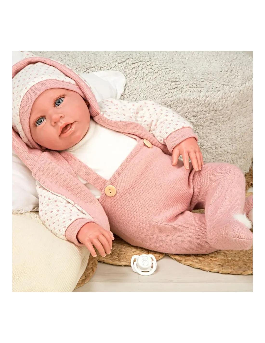 Bambola Reborn 38 cm dai tratti realistici con corpo in vinile, indossa un tenero completo con fiori, abbinato ad una fascia in testa; la confezione include una coperta doppiata rosa con lurex ed il ciuccio con catenella. La bambola è particolarmente realistica, con dettagli ricercati come la delicata venatura sulla pelle e l'effetto bagnato sulla boccuccia.