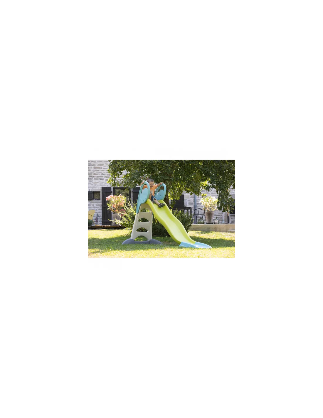 Fantastico scivolo in versione XS, per i bambini più piccoli, con attacco per il tubo (standard, non incluso) dell'acqua per una cascata di acqua fresca!