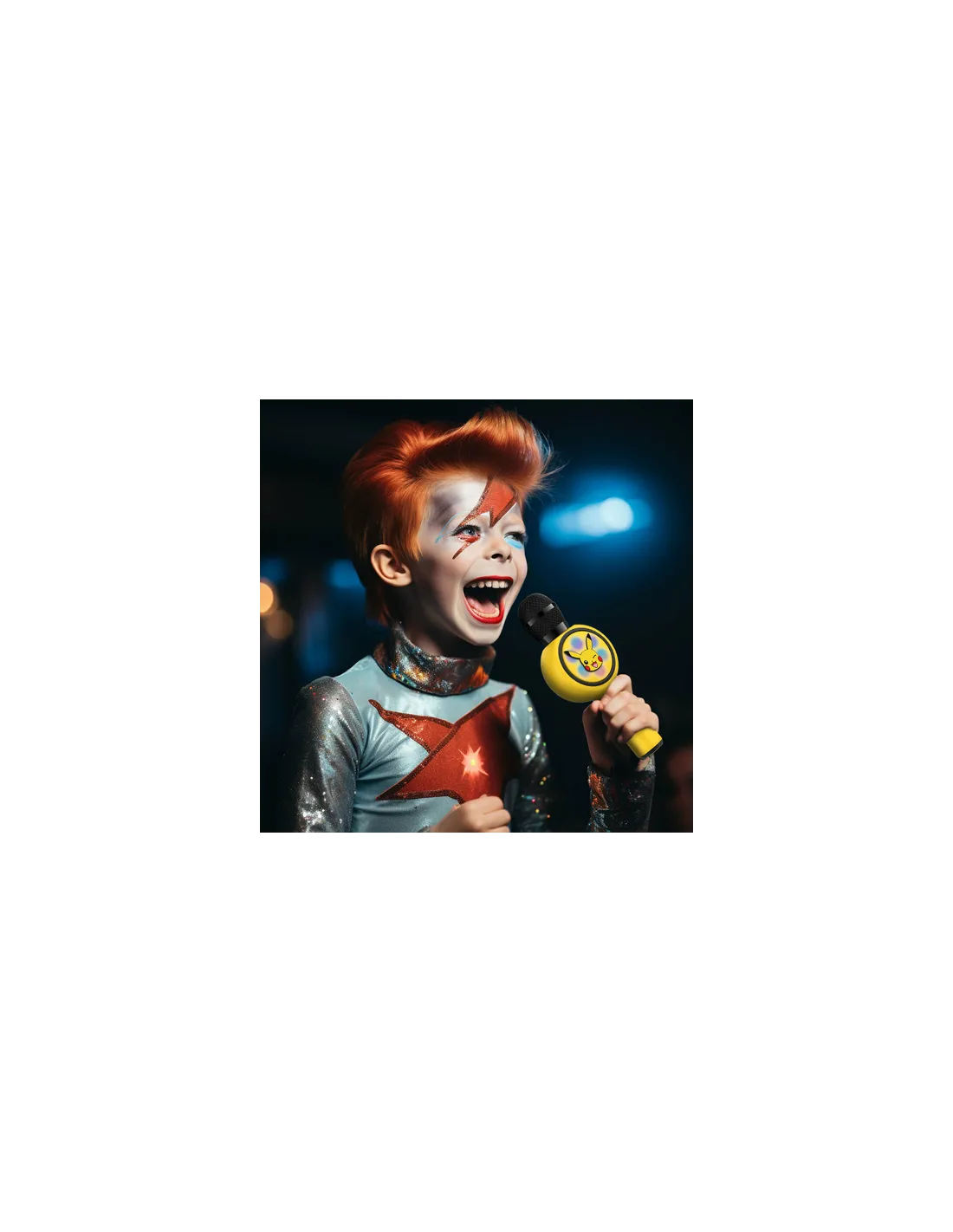 Microfono da palcoscenico, due microfoni per la voce con posizione regolabile, asta regolabile in altezza, 10 brani preregistrati, effetti applausi e brusio di folla, 6 ritmi di batteria, effetti luminosi, connessione ad un lettore di MP3, (smartphone, iPod, CD player...), cavetto incorporato ed alimentazione: 3 batterie da 1,5V R6/AA (non fornite).