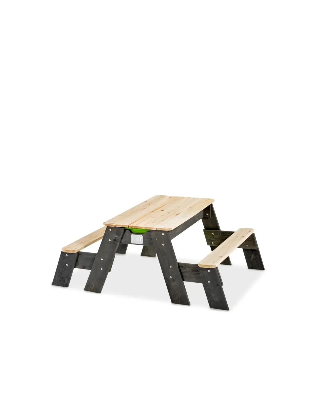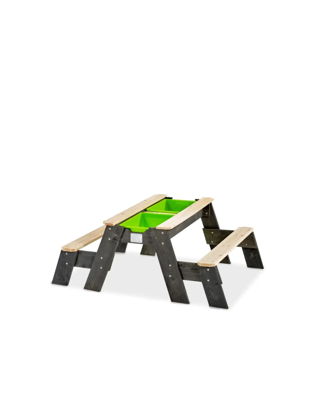 "Il tavolo da sabbia, acqua e picnic EXIT Aksent è multifunzionale. Il tavolo da sabbia, acqua e picnic è dotato di due contenitori verdi che possono essere riempiti con acqua o sabbia, oppure possono essere utilizzati per riporre i giocattoli. I contenitori verdi sono rimovibili e quindi facili da pulire.Il tavolo è dotato di due panche per consentire ai bambini di giocare in piedi o seduti. E se non si ha voglia di giocare con la sabbia o con l'acqua, è sufficiente chiudere il tavolo con il suo coperchio e portare con sé matite o macchinine, perché il tavolo può essere utilizzato anche per fare bricolage, disegnare o costruire. I tavoli con sabbia e acqua di EXIT Toys sono realizzati in legno di cedro certificato FSC® (FSC 100%, FSC® SCS-COC-007799). Questo tipo di legno non si scheggia ed è naturalmente resistente agli agenti atmosferici come la pioggia e quindi resistente al marciume del legno. Non è necessario trattare i tavoli di sabbia e acqua in legno EXIT prima dell'uso, i bambini possono giocarci in tutta sicurezza fin dall'inizio."