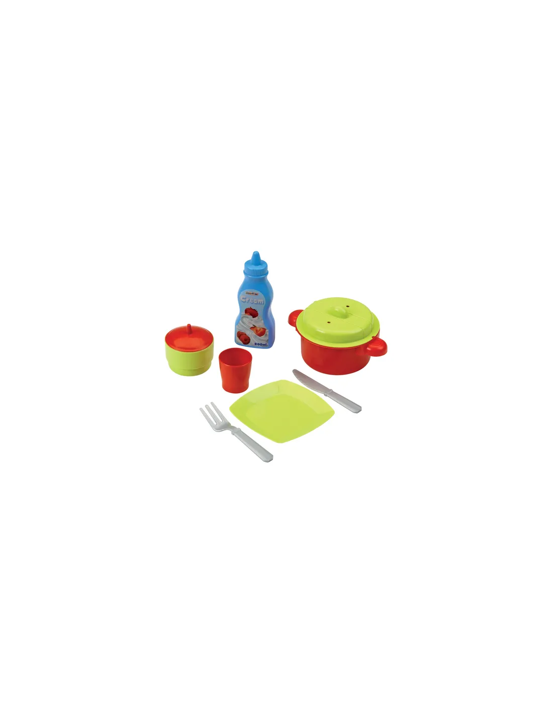 Questa confezione contiene le forniture essenziali per affrontare la giornata: 1 bottiglia d'acqua, 1 bottiglia di succo d'arancia, 1 bottiglia di latte, ketchup, maionese, 2 lattine, 1 vasetto di creme spalmabili, 4 yogurt, 2 bibite e 6 arance. Consigliato a partire dai 18 mesi grazie alle confezioni grandi degli articoli. Di fabbricazione francese..