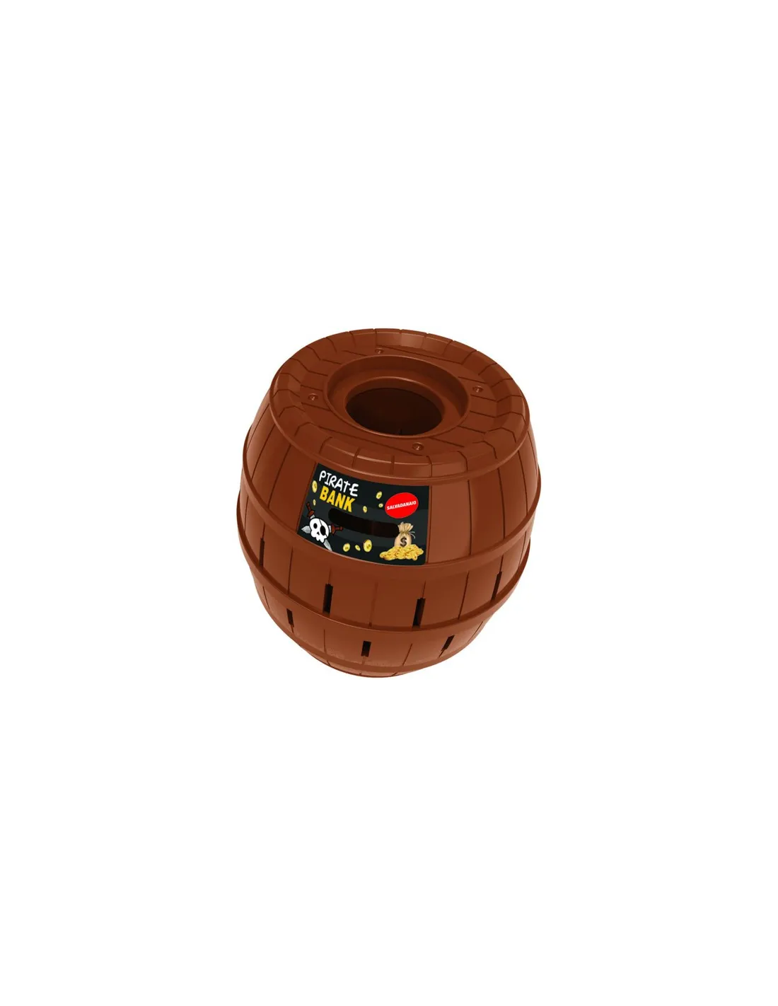 Per giocare bisogna inseirire il pirata nel barile e farlo girare qualche volta. Vince il giocatore che non fa saltare in aria il pirata. Contiene 1 barile/salvadanaio, 1 pirata e 4 set di spade colorate. Num Giocatori: 2-4