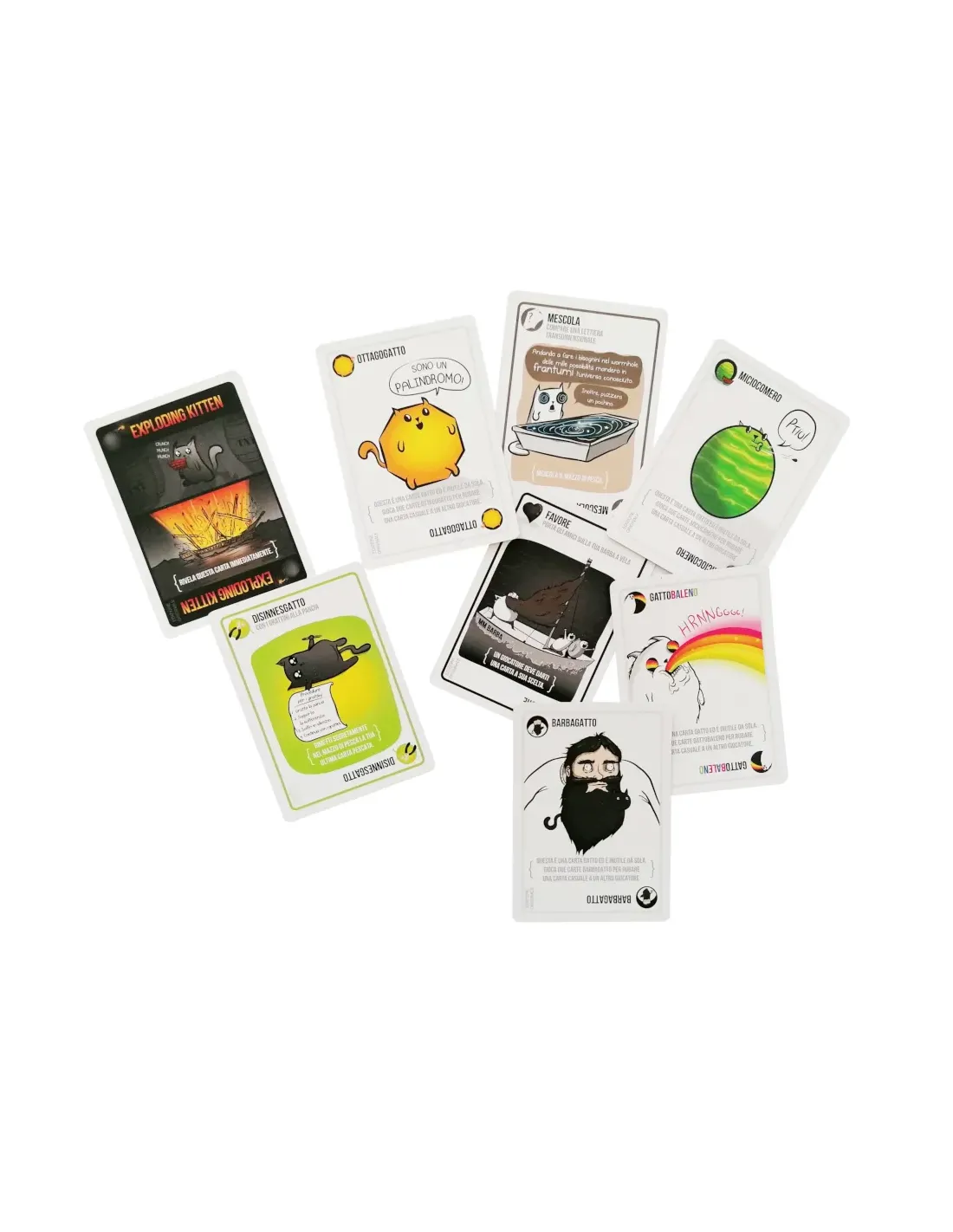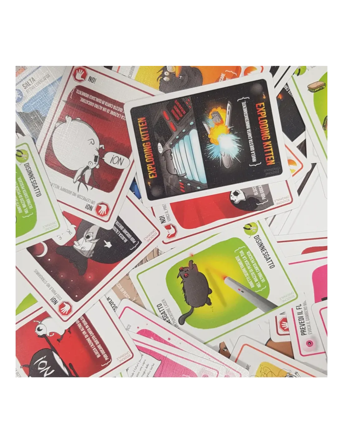 Qui troverete alcune carte tratte dalle espansioni e, naturalmente tutte le carte del gioco base per 10 giocatori; come si gioca: i giocatori giocano carte dalla propria mano e concludono il turno pescando dal mazzo centrale, con il rischio quindi di pescare una carta Exploding Kitten: a quel punto chi ha pescato la carta esplode, è eliminato, a meno che...