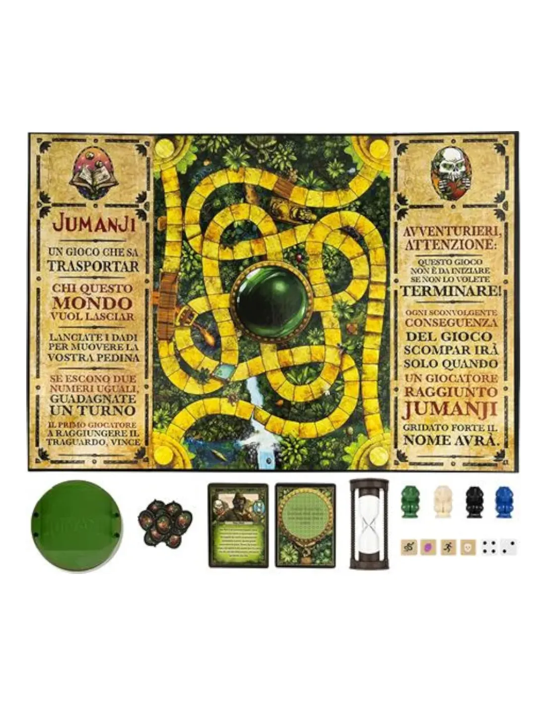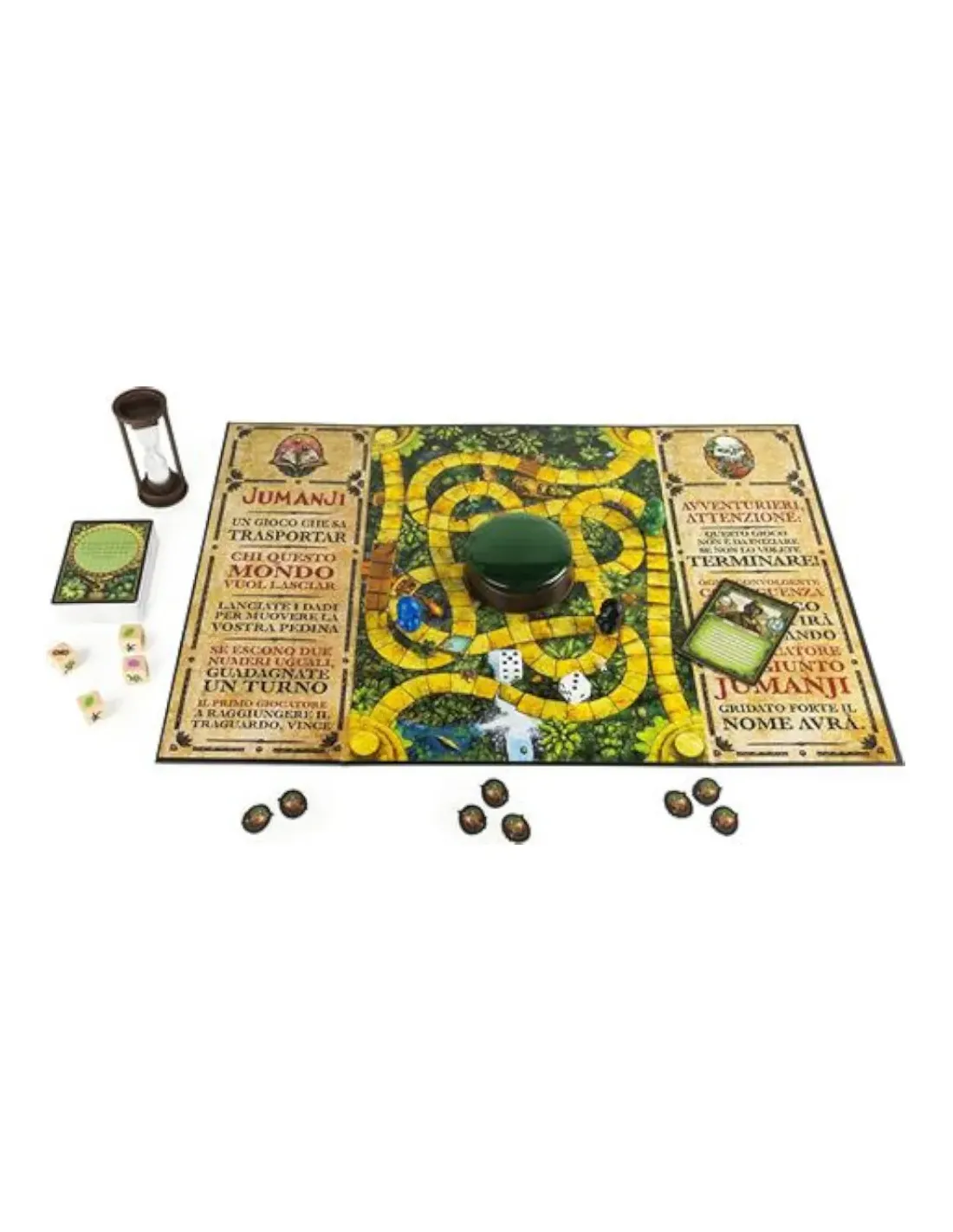 Jumanji il classico dei giochi da tavolo che permette di giocare in famiglia o con gli amici, da un minimo di 2 fino ad un massimo di 4 giocatori, per divertirsi sfidando parenti ed amici! Porta voi ed i vostri compagni di avventura in una missione attraverso la giungla, risolvendo enigmi e completando sfide mentre cercate di non perdere i vostri Gettoni...