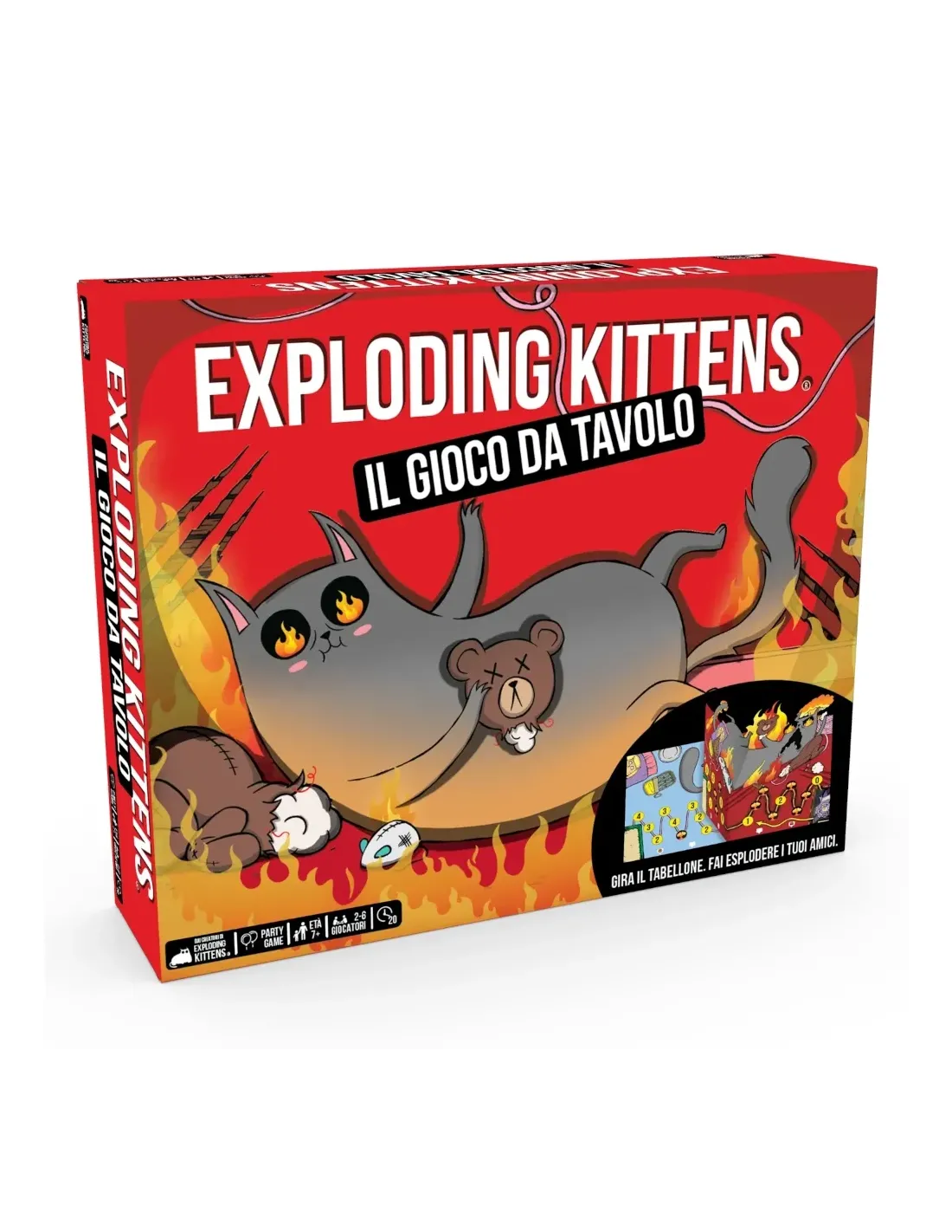 Una versione altamente strategica e potentemente felina della roulette russa, super divertente ed adatta a tutti; come si gioca: I giocatori giocano carte dalla propria mano e concludono il turno pescando dal mazzo centrale, con il rischio quindi di pescare una carta Exploding Kitten. A quel punto chi ha pescato la carta esplode, è eliminato, a meno che...