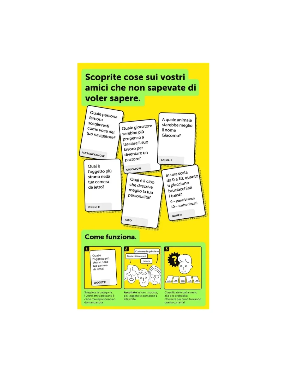 Ascoltate le risposte dei vostri amici ed individuate la domanda (stupida) corretta tra cinque possibilità, ordinando le domande dalla meno alla più probabile per ottenere punti! Le carte sono suddivise in macro-categorie per rendere il tutto più difficile..