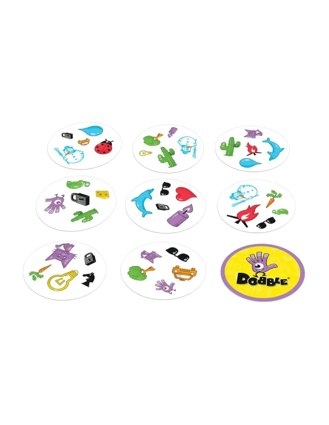 Dobble è più di 50 simboli, 55 carte, 8 simboli per carta e sempre un solo simbolo in comune tra due carte qualsiasi; sta a voi trovare quale.. Dobble comprende tanti mini-giochi basati sulla rapidità in cui tutti i giocatori agiscono allo stesso tempo; indipendentemente dal tipo di gioco, dovete sempre essere i più rapidi a trovare il simbolo identico...