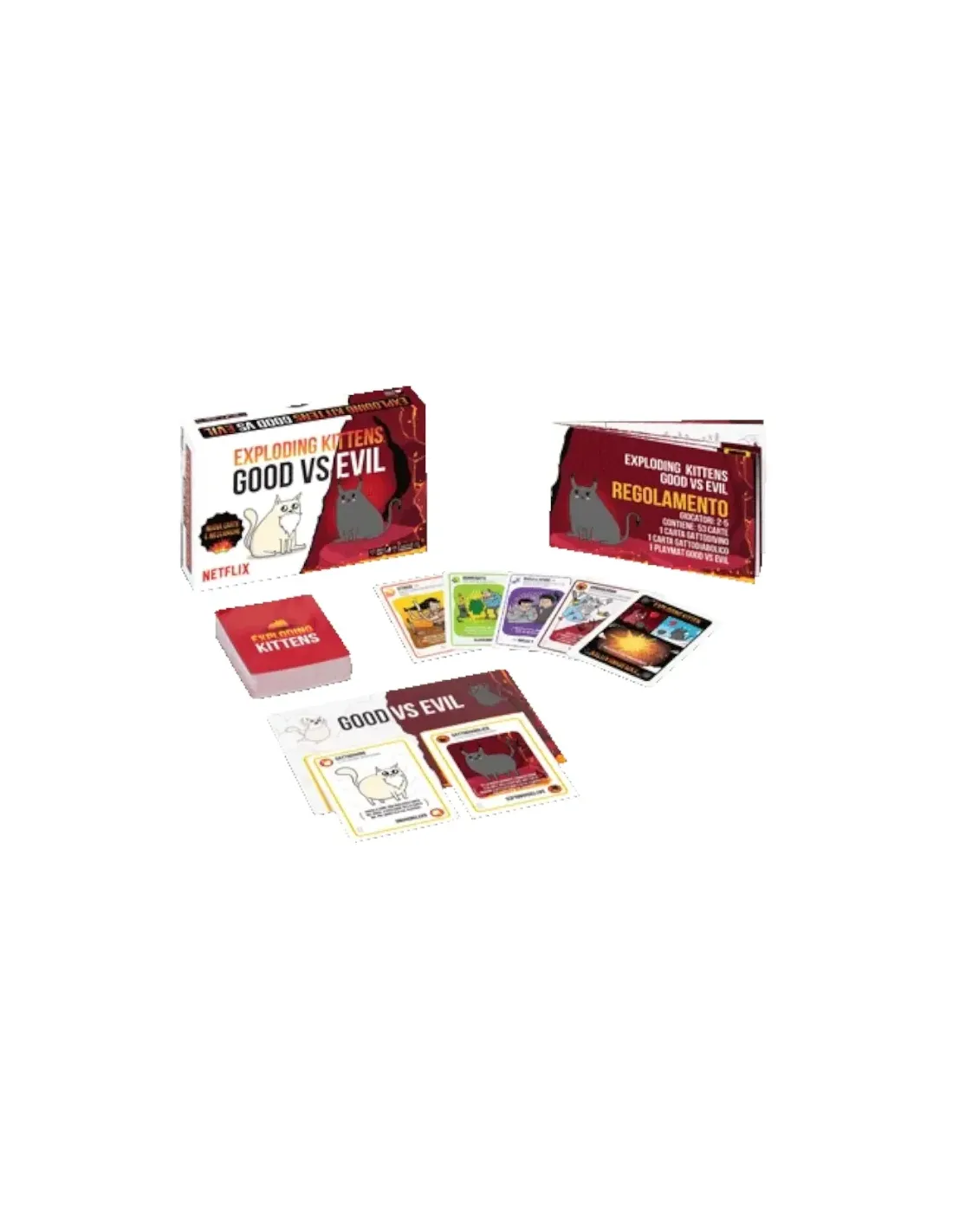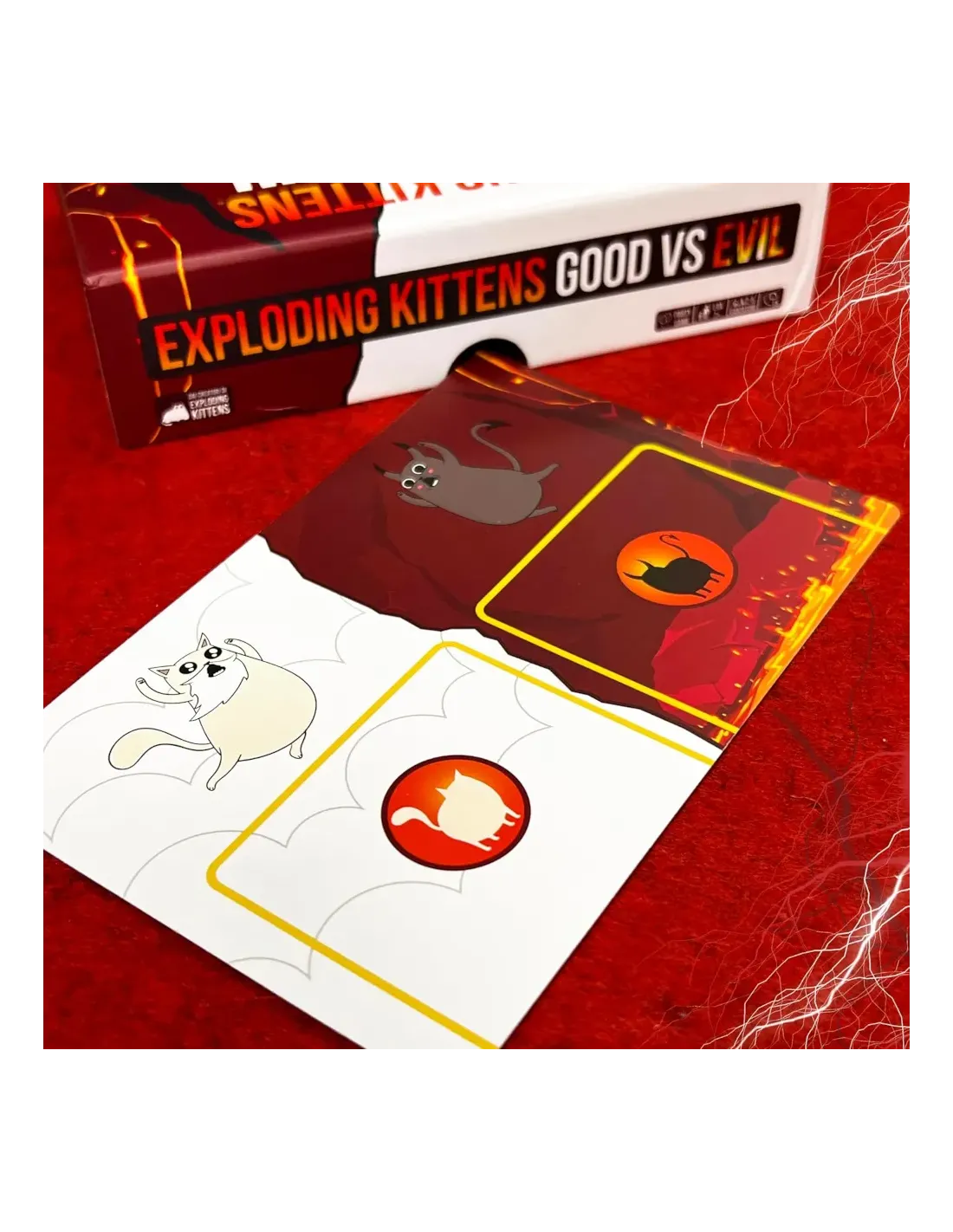 I giocatori pescano carte fino a quando qualcuno non pesca la carta Exploding Kitten; a quel punto, quel qualcuno esplode e perde la partita.. A meno che quel giocatore non abbia una carta Disinnesgatto con un puntatore laser oppure un sandwich di erba gatta. Usate le carte azione per evitare di pescare, sbirciate segretamente le carte in cima al mazzo,...