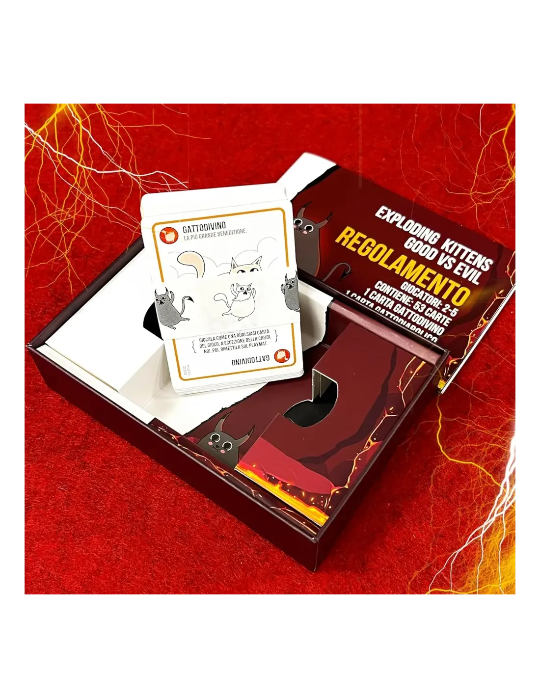Include tutte le carte della versione originale di Exploding Kittens più un morbidosissimo e pucciosissimo gatto ladro! Passate il gatto di gomma piuma (schiuma) ai vostri avversari per rubare le loro preziose carte; ma state attenti, perché l’essere un grande ladro vi rende anche un grande bersaglio.