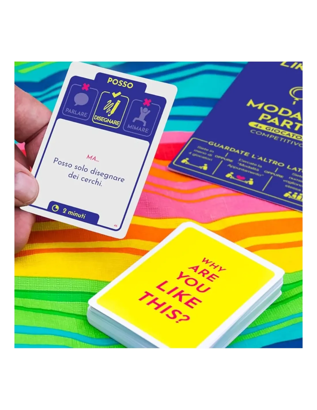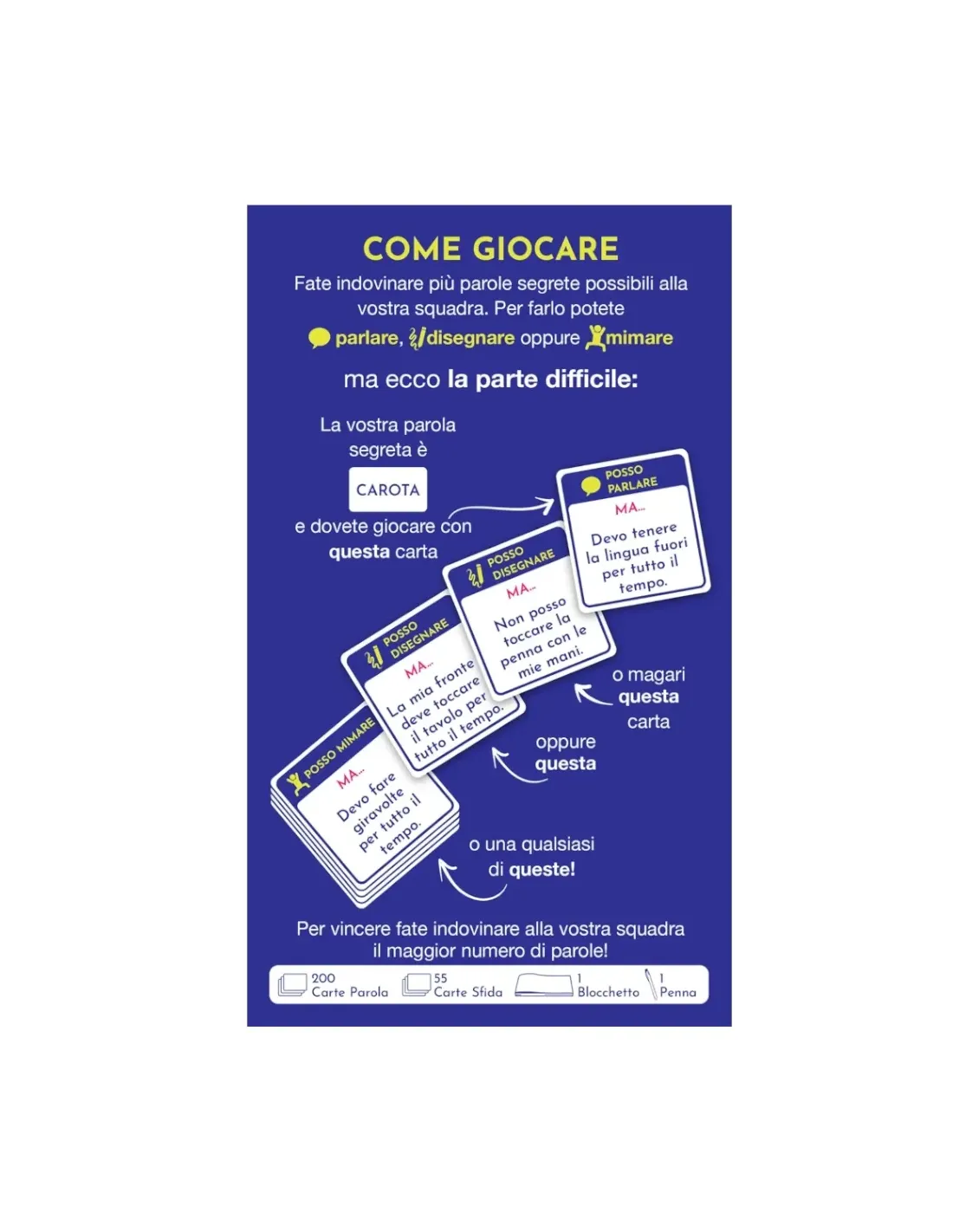 200 Carte Parola, 55 Carte Sfida, un Blocchetto, una Penna e un Regolamento.