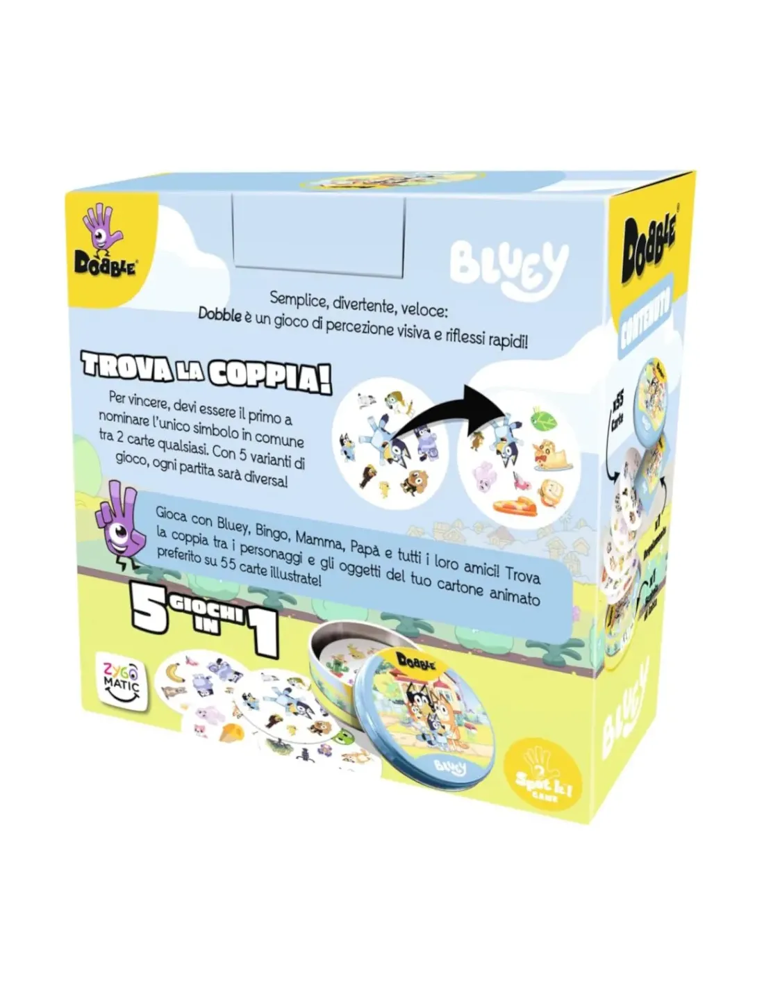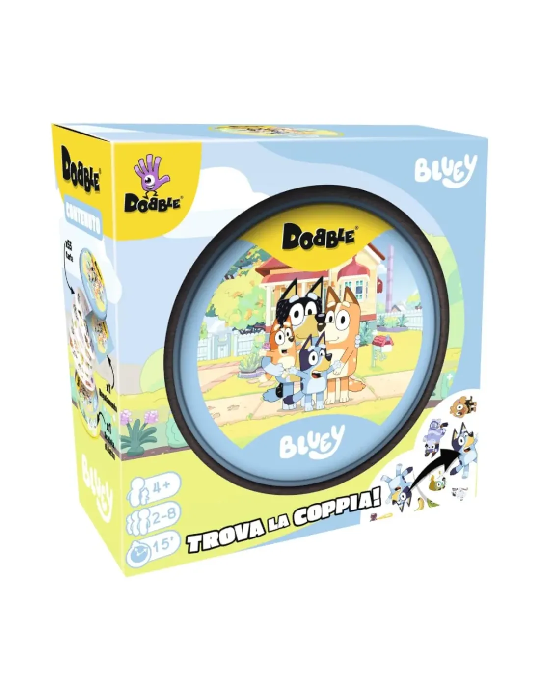 Nominate l’unico simbolo in comune tra le carte della vostra mano e quelle già collocate sul tavolo per allineare nuove carte, dovete essere la squadra più veloce a collegare quattro carte del vostro colore in fila per vincere un round; aggiudicatevi più round per ottenere la vittoria. Tutti giocano simultaneamente, quindi bloccate le altre squadre con le...