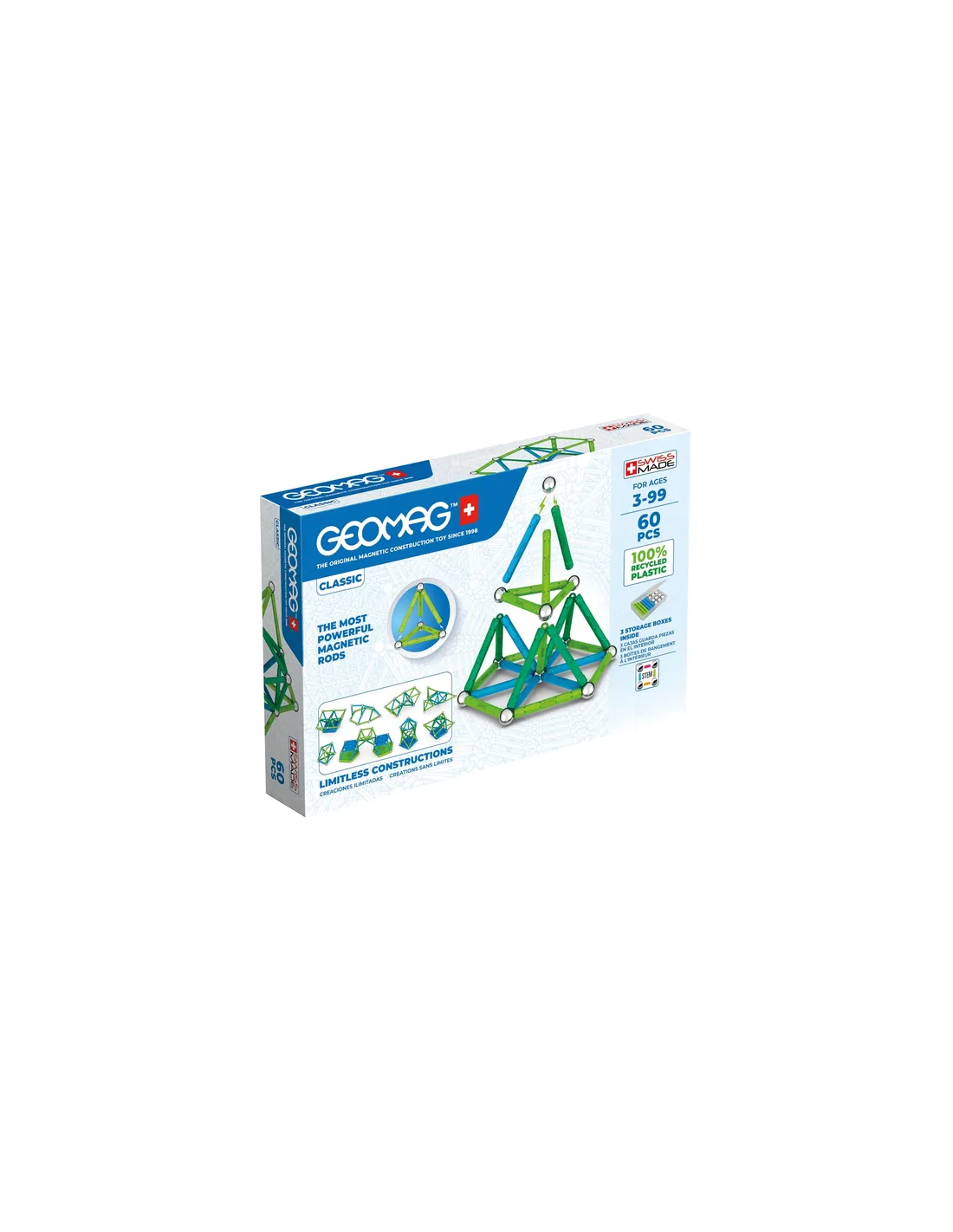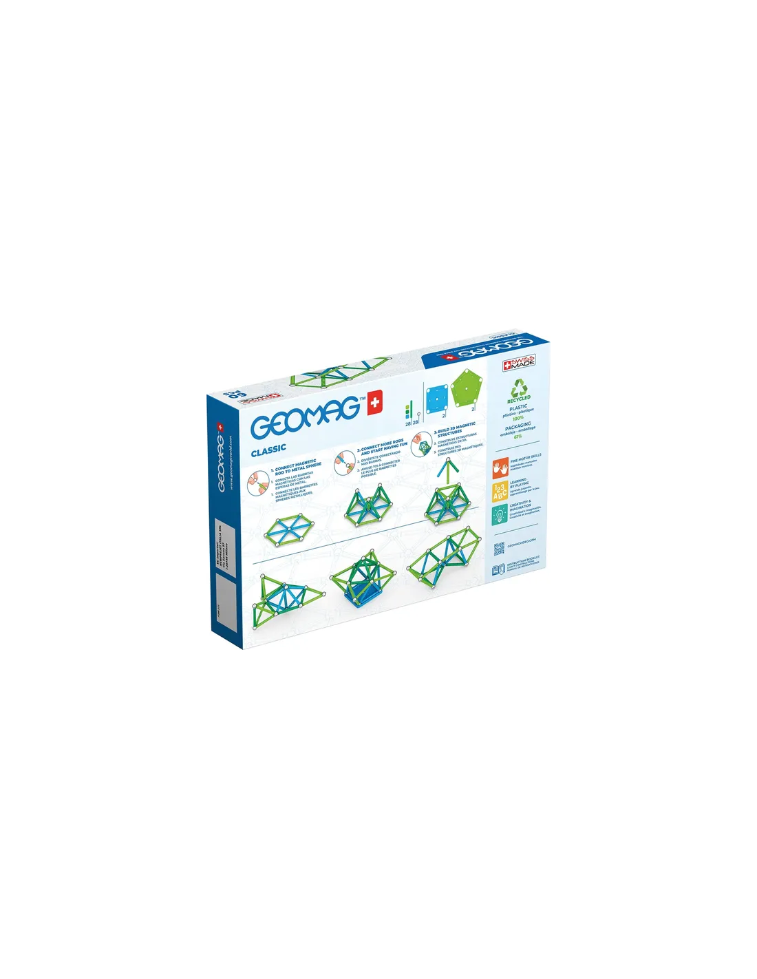 Il potere del magnetismo al servizio della tua immaginazione. Componenti realizzare in Svizzera con plastica 100% riciclata compatibili con tutti i set Geomag Classic e Panels. 60 pezzi di cui 28 sfere metalliche, 28 barrette magnetiche, 2 pannelli quadrati e 2 pannelli pentagonali. Con 3 scatole tascabili per riporre tutto a fine progetto e portarlo sempre con te.