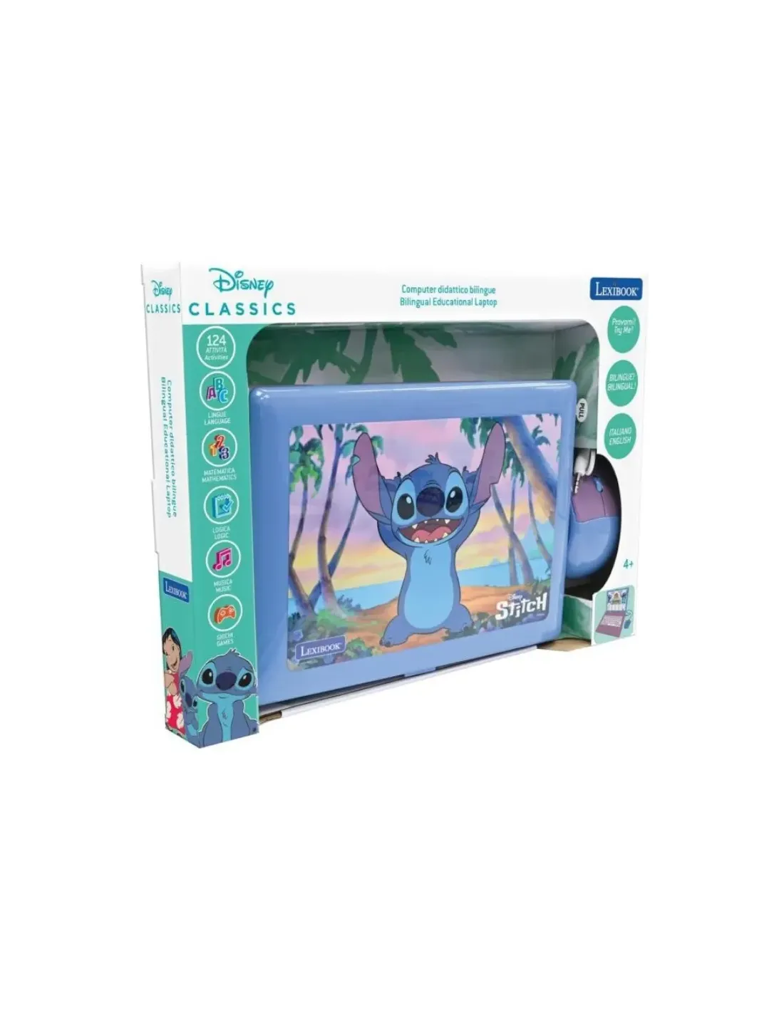 124 attività (62 in ogni lingua) per un'esperienza di apprendimento divertente ed interattiva, grande schermo 5,1 x 9,7 cm; contenuto educativo: italiano ed inglese, matematica, dattilografia, logica ed infine musica. Ergonomia ispirata ai veri computer portatili, con un mouse ed una tastiera realistici. Design elegante e sottile, con tanti giochi inclusi..