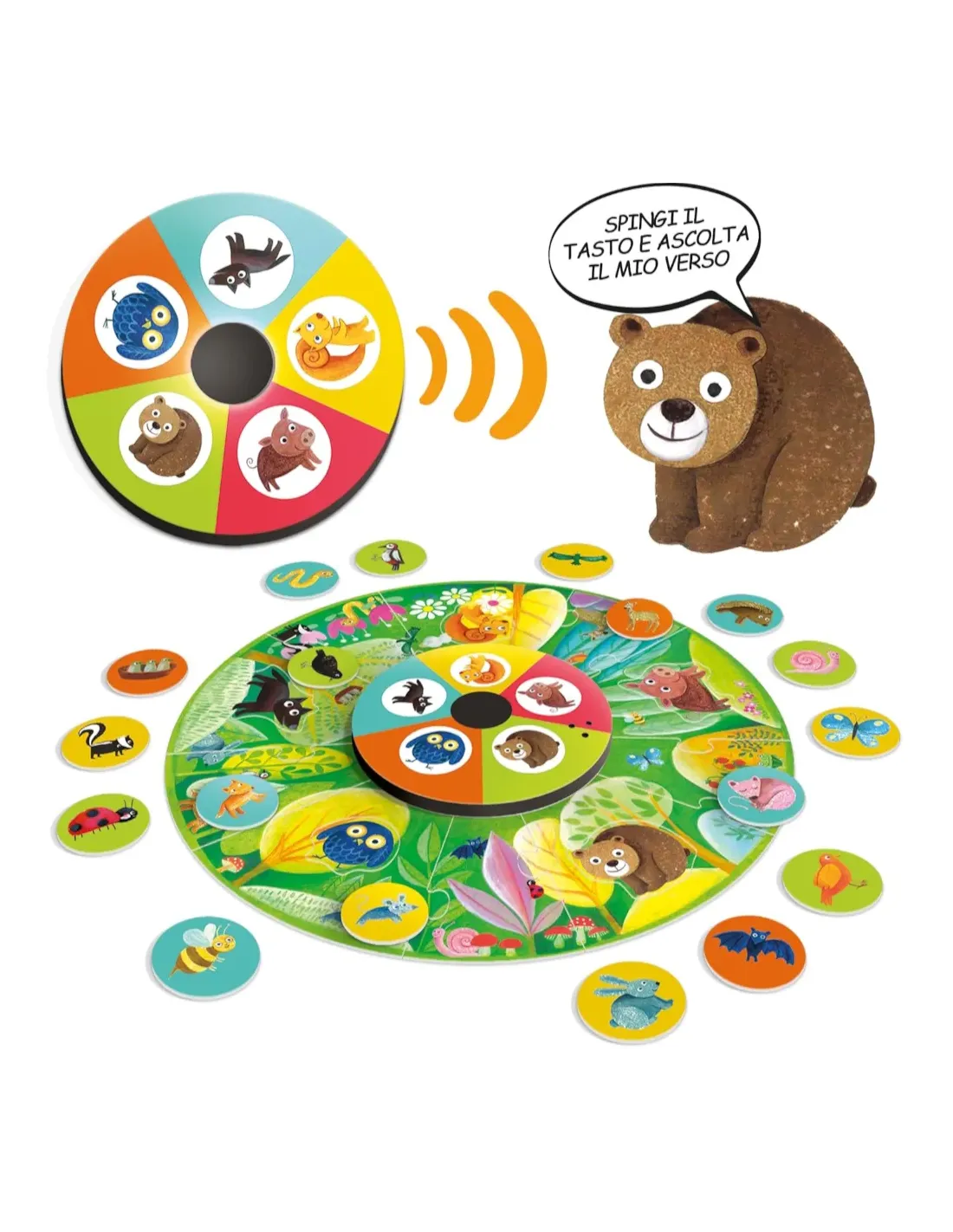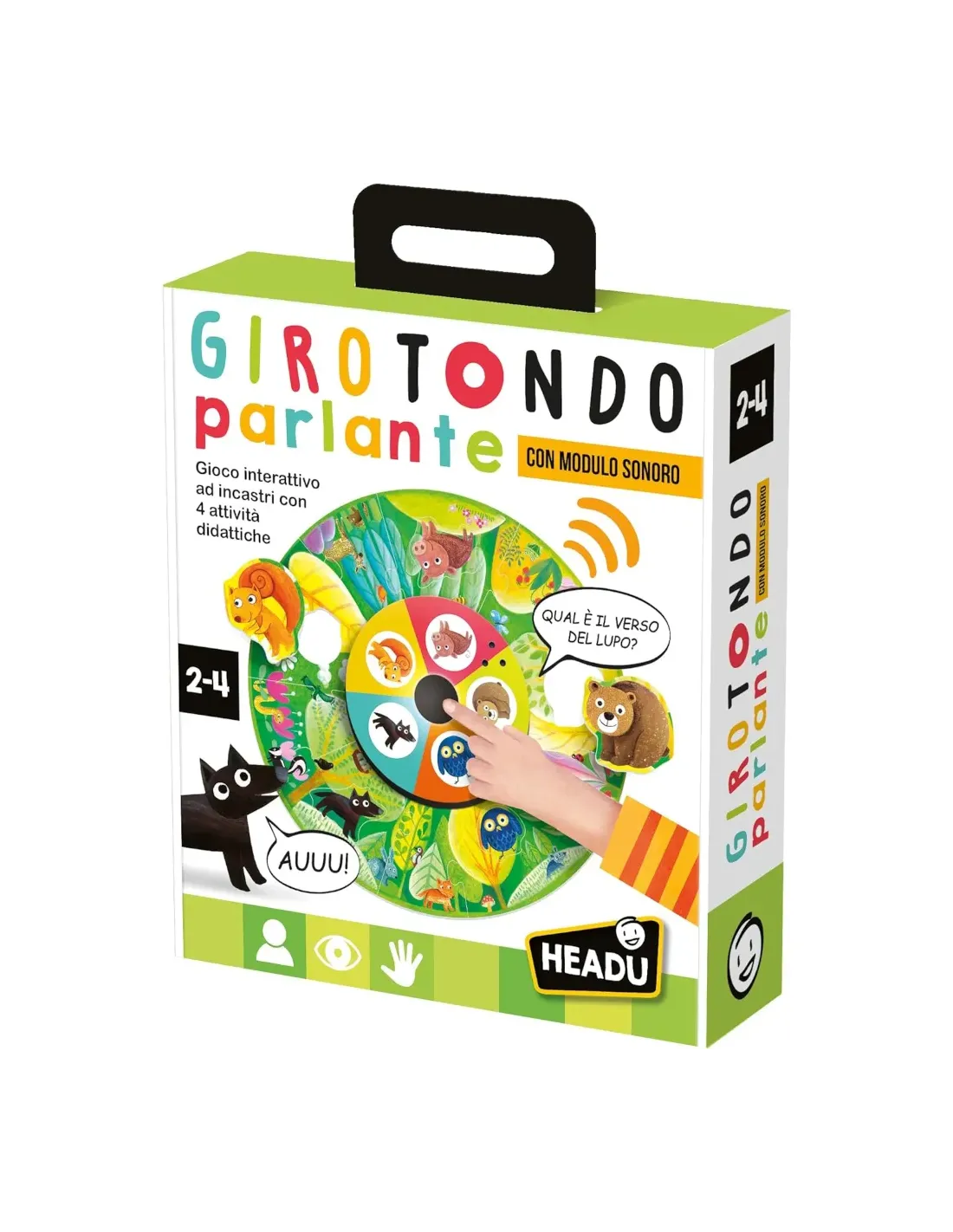 Come fa il lupo? E qual è il verso dell’orso? Gioca con le sagome ad incastro, ascolta i versi degli animali e rispondi alle domande. Con questo gioco interattivo, i bambini si divertono con quattro originali attività didattiche. Girotondo parlante è uno dei giochi a marchio Headu.