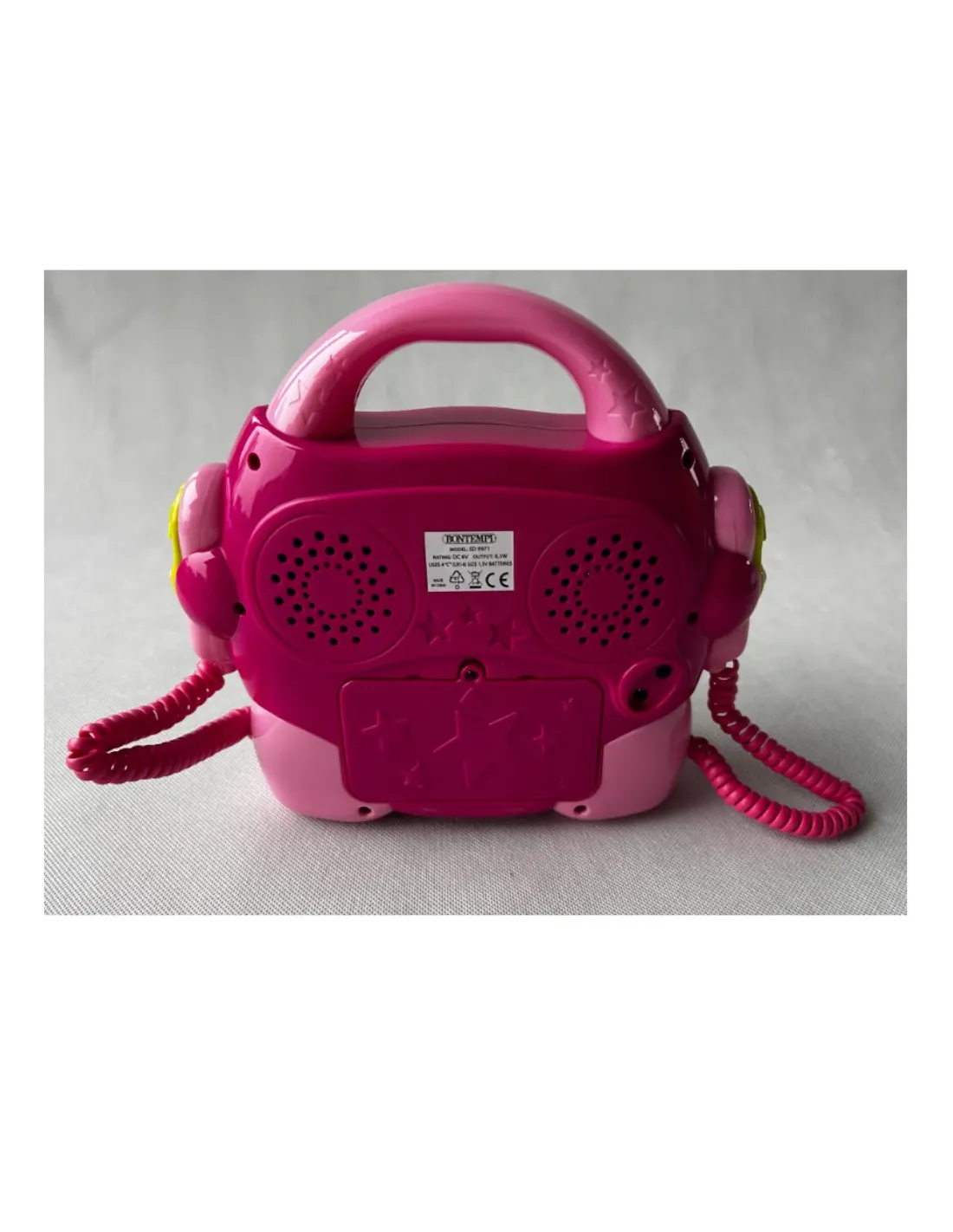 Dotato di 2 microfoni, effetti luminosi, display luminoso con indicatore numerico della traccia, manopola di accensione/spegnimento/volume, manopola volume microfoni, sistema di selezione traccia, programmazione dei brani da ascoltare in sequenza, funzione pausa, testo ripetizione brano, presa per cuffia e presa di adattatore di rete non inclusi.