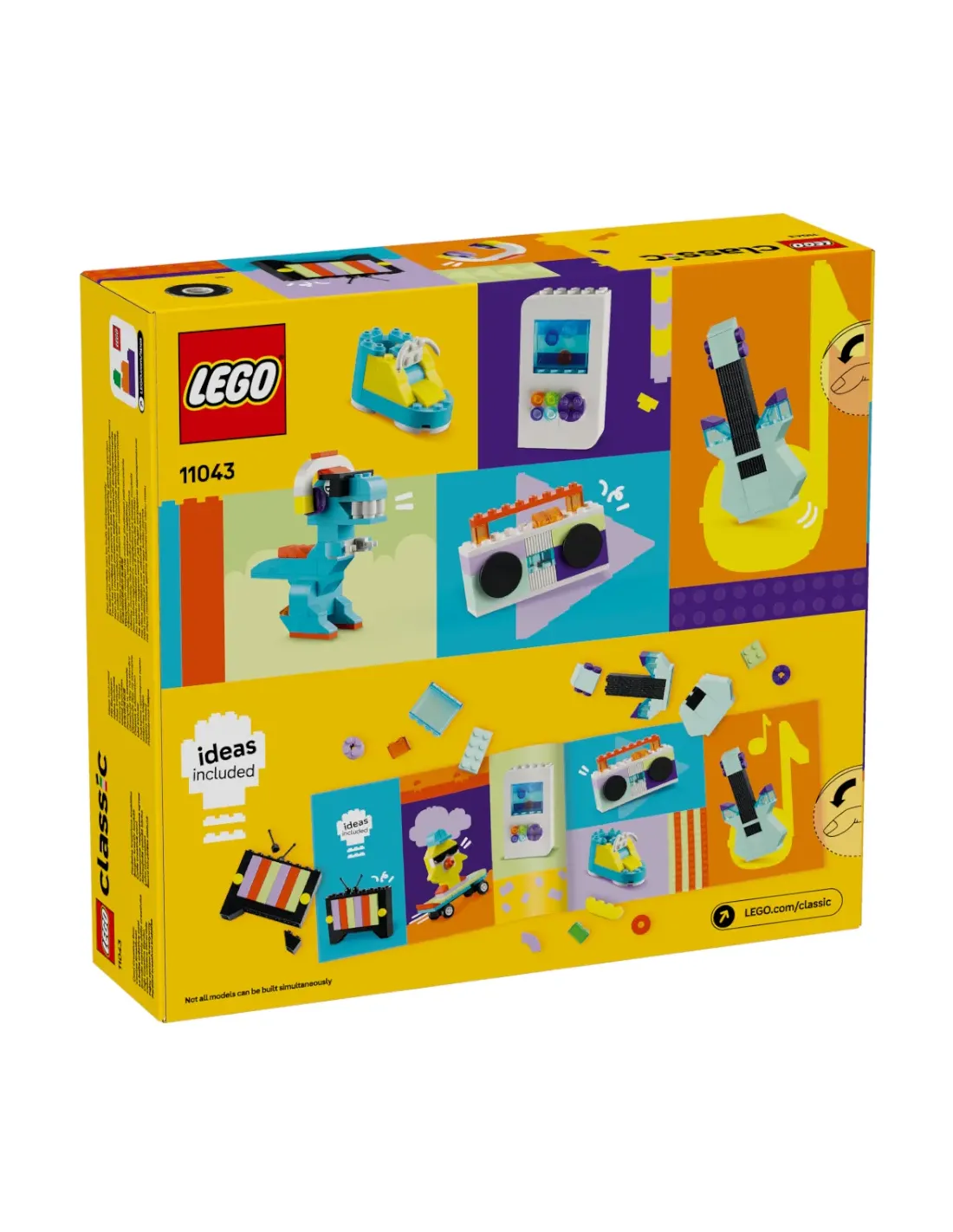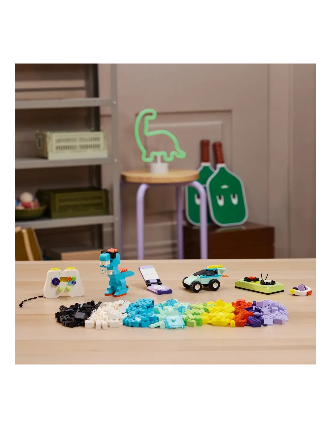 Tanti mattoncini colorati, oltre a occhi, ruote e cerniere, massimizzano la giocabilità di questo versatile set. I giocattoli costruibili includono un controller di gioco, un dinosauro con occhiali, un cellulare apribile e chiudibile, uno skateboard, un monster truck e un kit da DJ con cuffie. I modelli possono essere combinati e personalizzati per un divertimento ancora maggiore, ad esempio mettendo le cuffie al dinosauro e il dinosauro sullo skateboard.