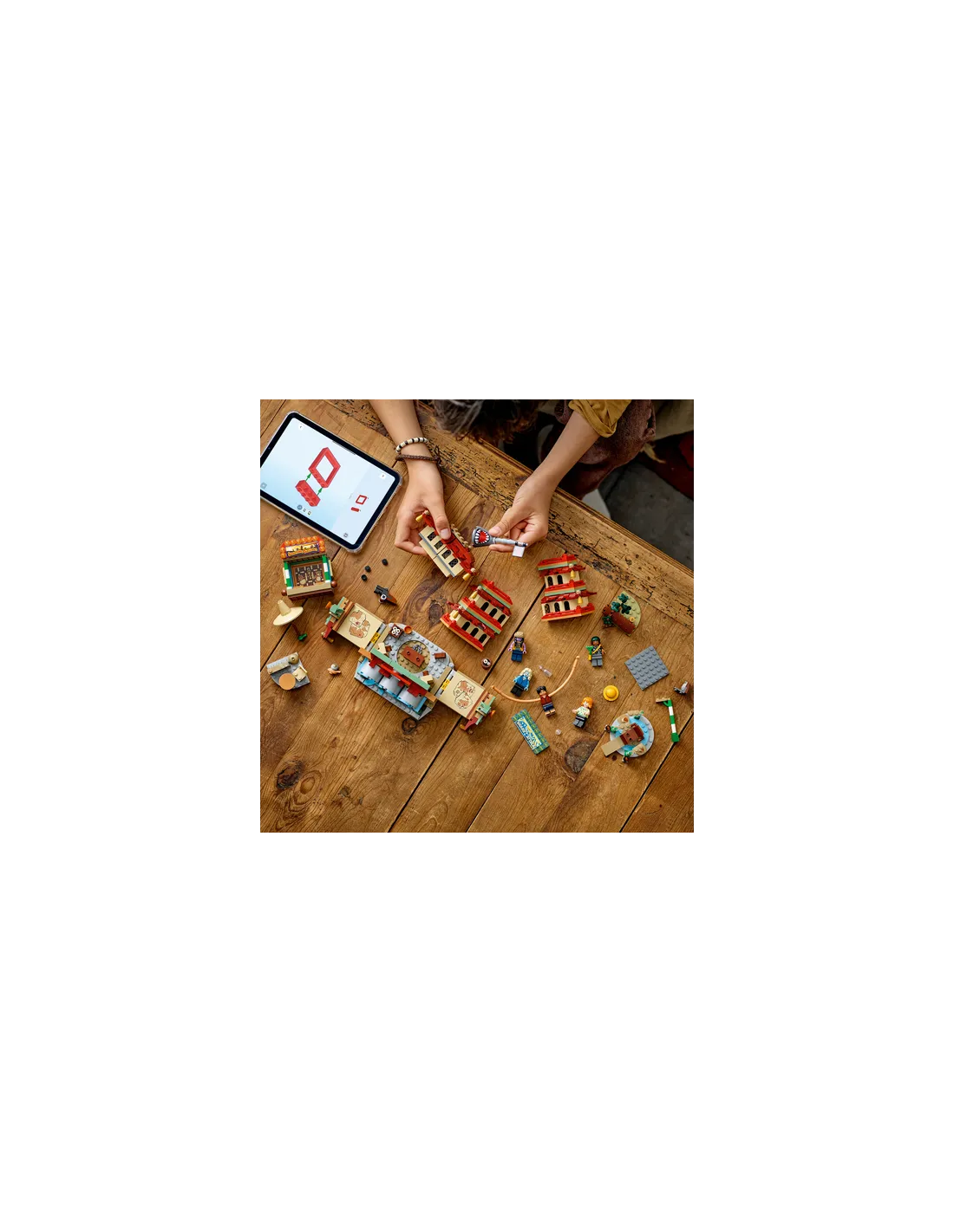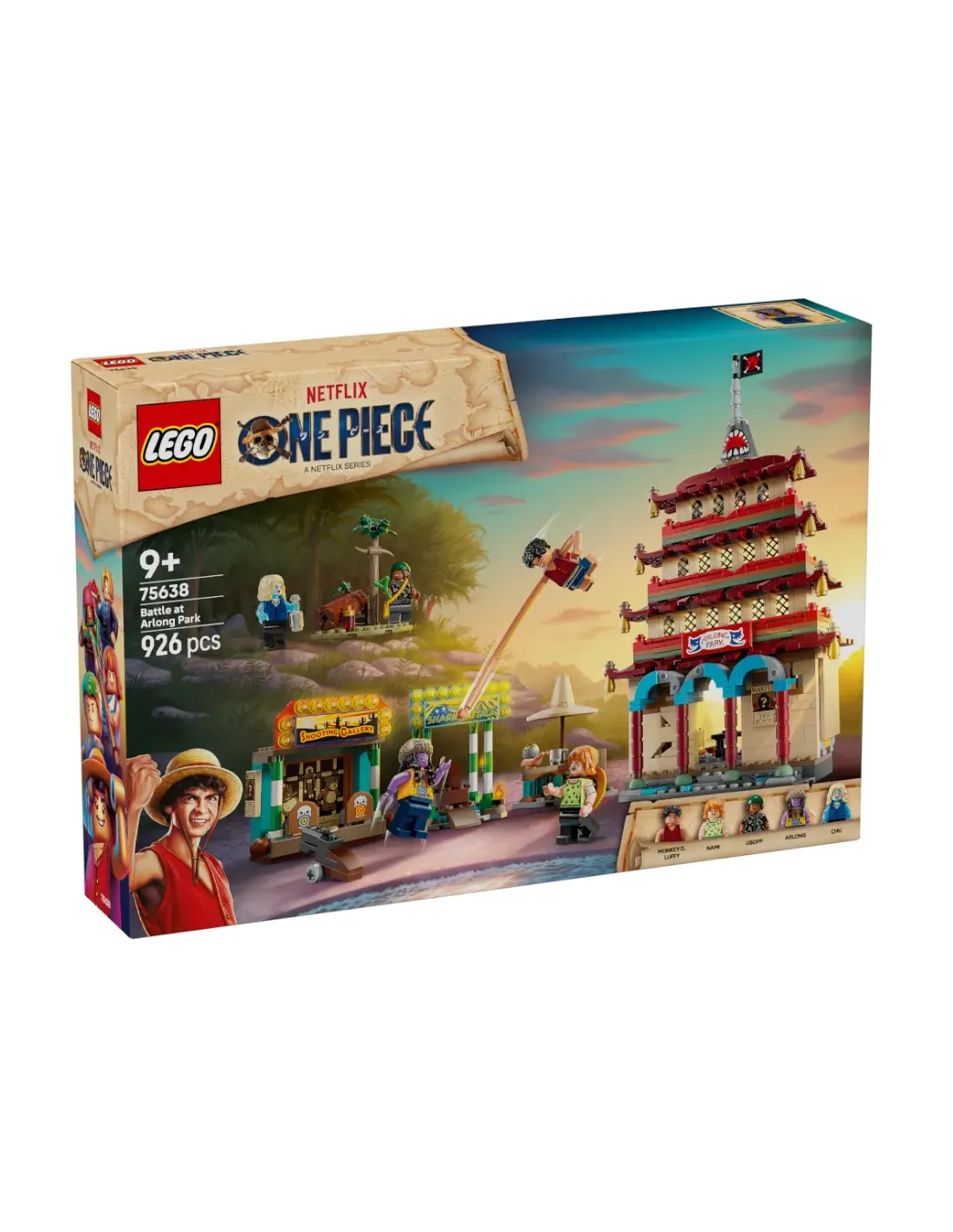 Il set da costruzione contiene le minifigure di Luffy – con pezzi per allungare le sue braccia – Nami, Usopp, Arlong e Chu. I bambini possono far crollare il modello della pagoda durante la battaglia toccandolo sulla parte superiore, mentre il tiro a segno offre ai bambini divertenti bersagli da colpire con gli shooter. Il cattivo Arlong può essere posizionato su un trono all’interno dell’edificio dell’attacco degli squali. Chu può bere qualcosa nella baracca e la foresta contiene un’iconica bottiglia di ketchup. Questo set da gioco contiene anche shooter e accessori, tra cui 3 poster “Ricercato”. Per tanto divertimento digitale in più, i costruttori possono ingrandire, ruotare i modelli in 3D e seguire i loro progressi utilizzando l’intuitiva app LEGO Builder. Il set contiene 926 pezzi.