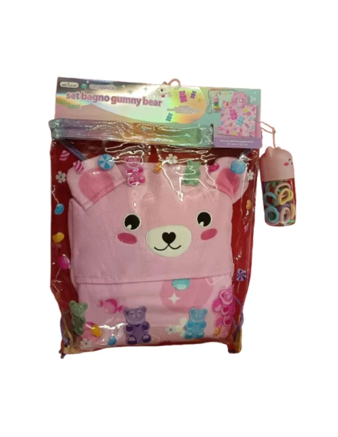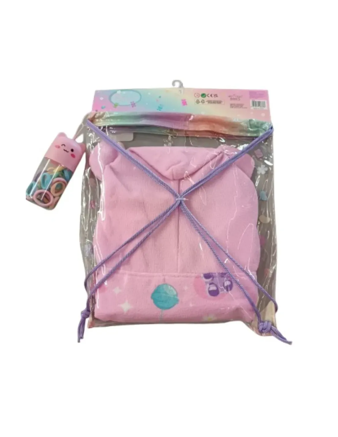 Coulisse con poncho con cappuccio sagomato e simpatico contenitore con elastici per capelli.