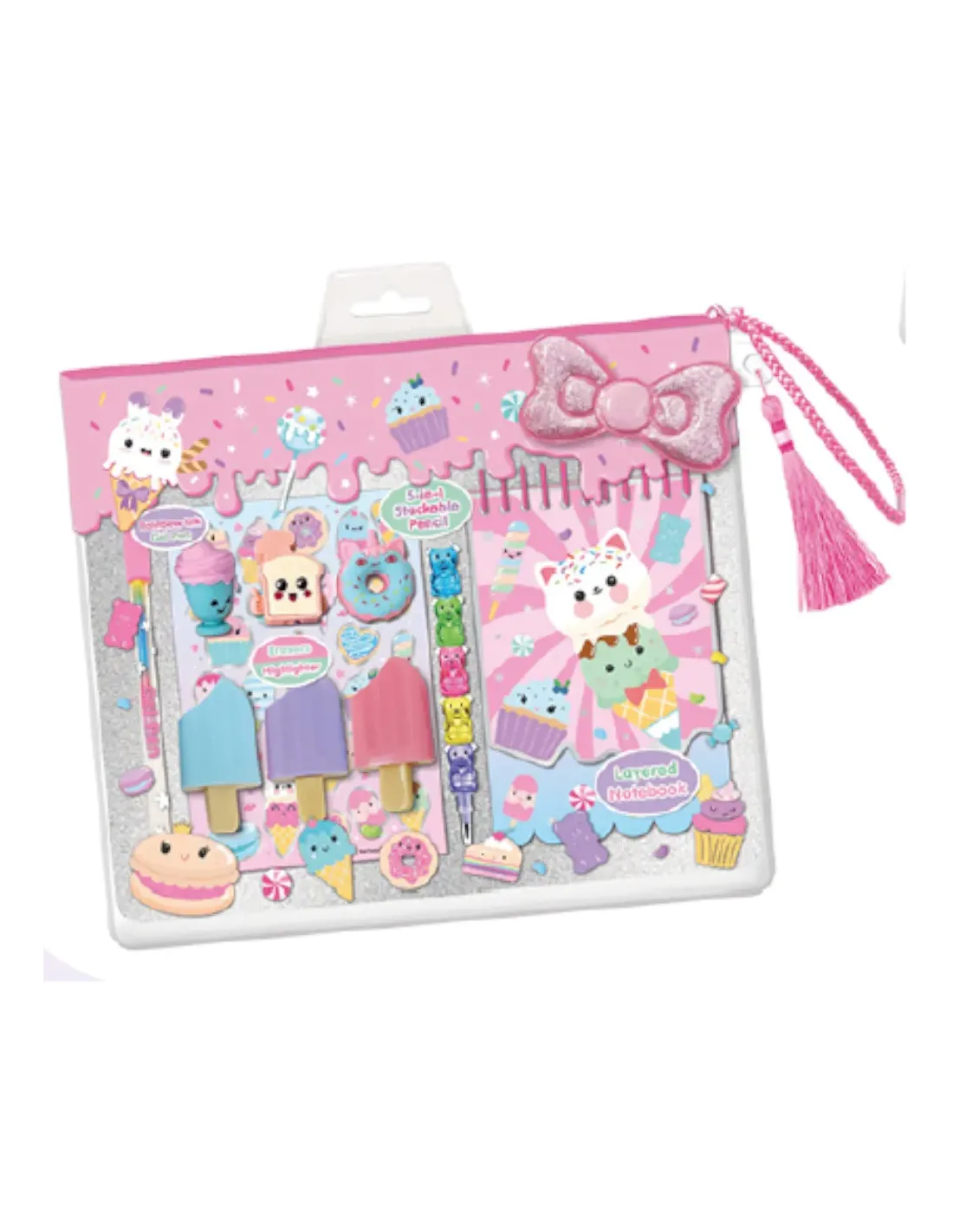 Pochette con notes sagomato,1 penna gel,1 foglio stickers,5 mini matite impilabili, 3 gomme, 3 evidenziatori sagomati.