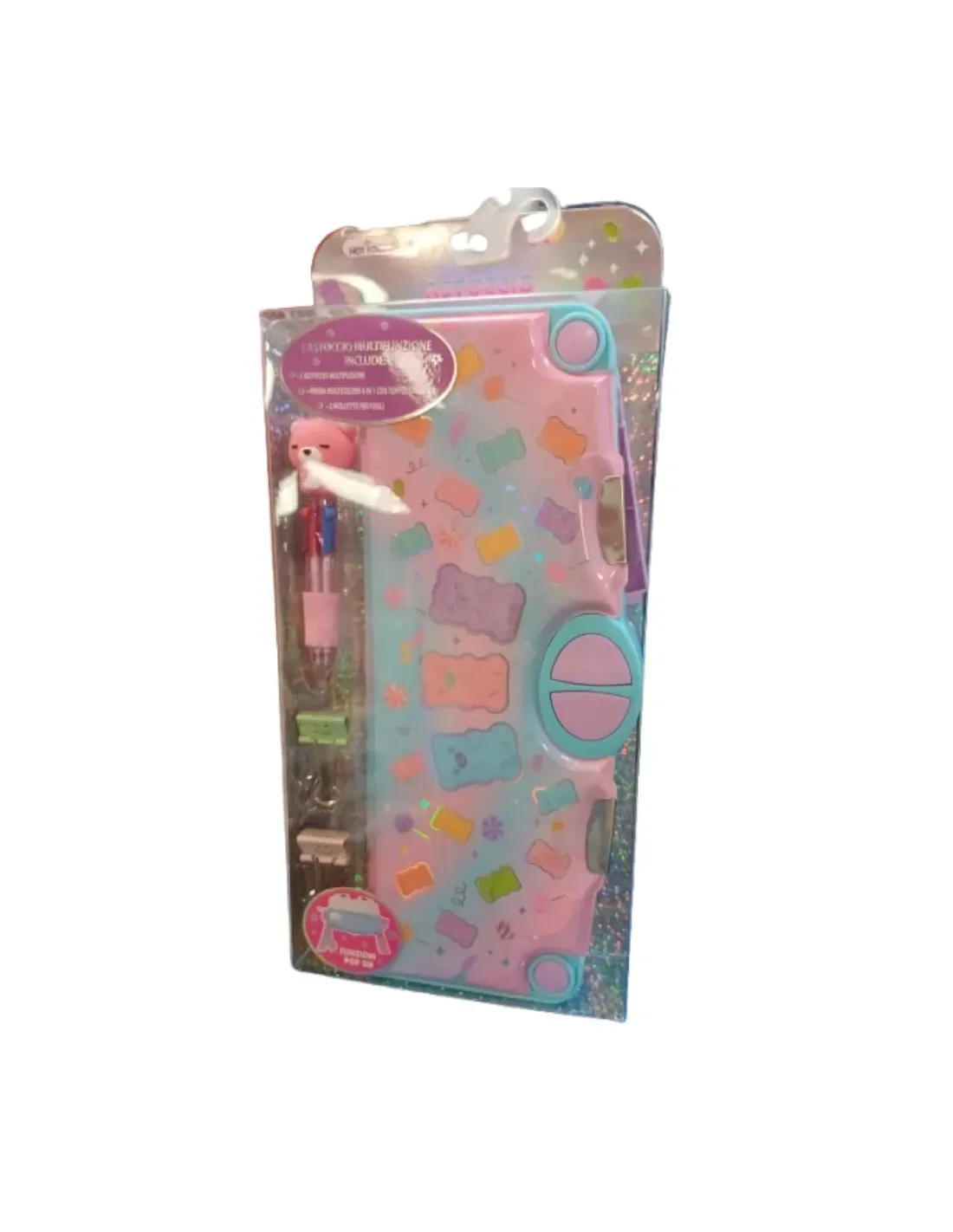 Pochette con 2 tasche con 1 mini notebook spiralato, calcolatrice, 1 penna con topper sagomato, 1 foglio di stickers.