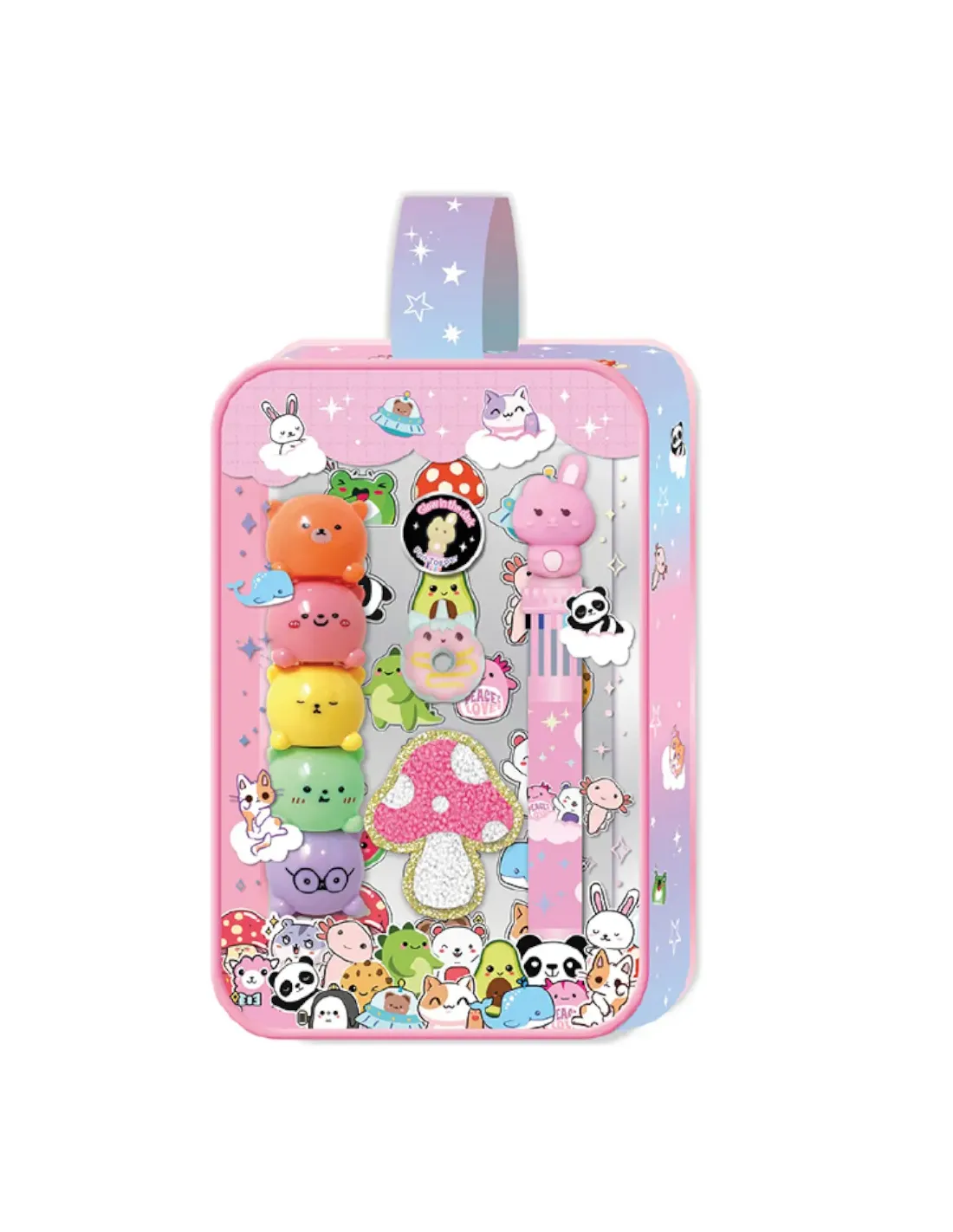 Beauty con gomma sagomata, 5 mini evidenziatori sagomati impilabili, penna 10 colori, foglio di stickers.