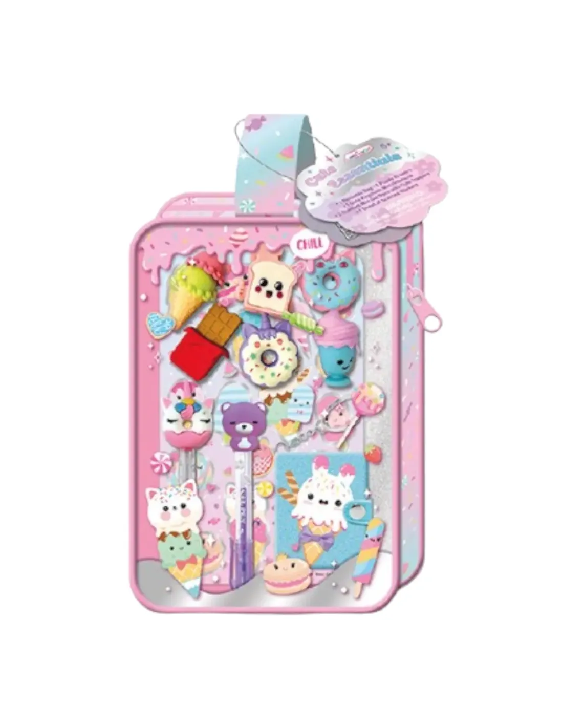 Pochette con notebook, stickers profumati, 2 gomme, stickers gioiello, 4 pennarelli profumati, 5 matite impilabili.