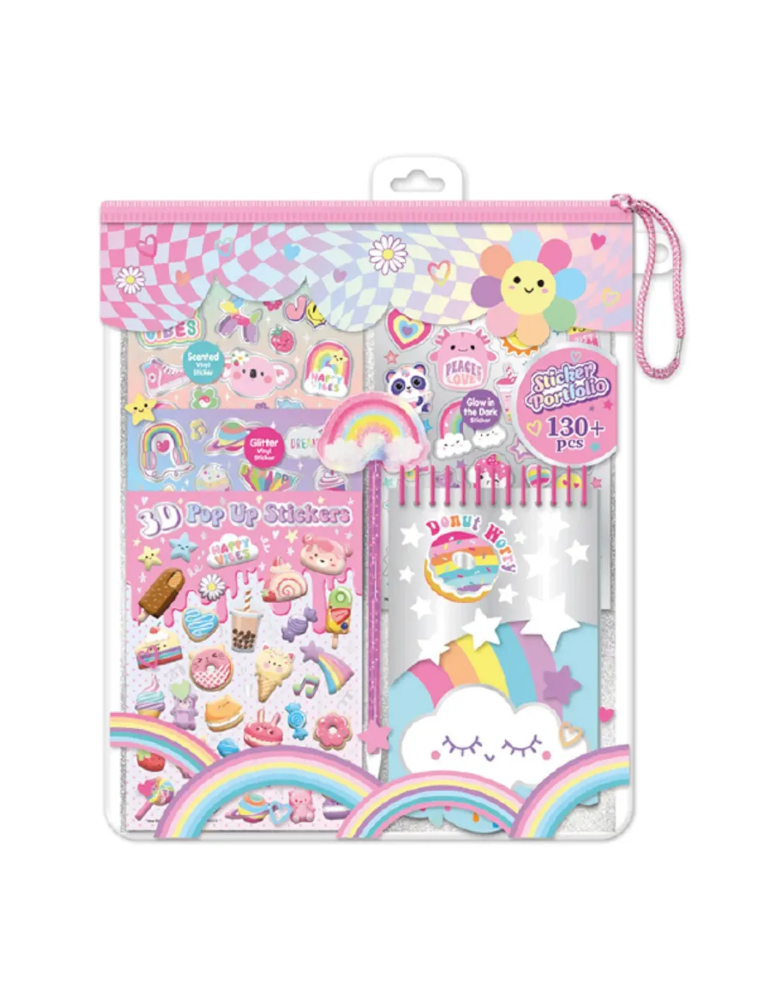 Pochette con notebook, stickers profumati, 2 gomme, stickers gioiello, 4 pennarelli profumati, 5 matite impilabili.