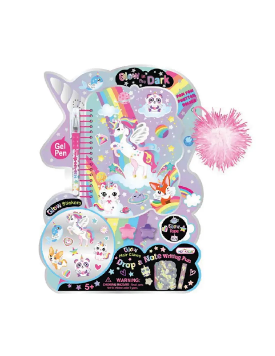 Set luminoso: blocknotes sagomato e spiralato, penna gel, stickers luminosi, scotch, 2 fermagli luminosi per capelli, 1 elastico con pon pon.