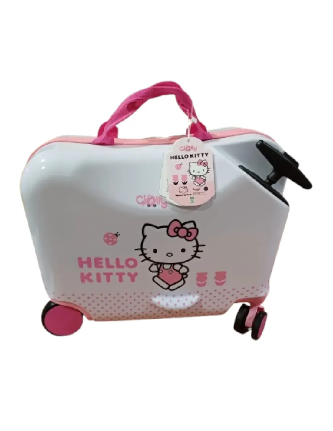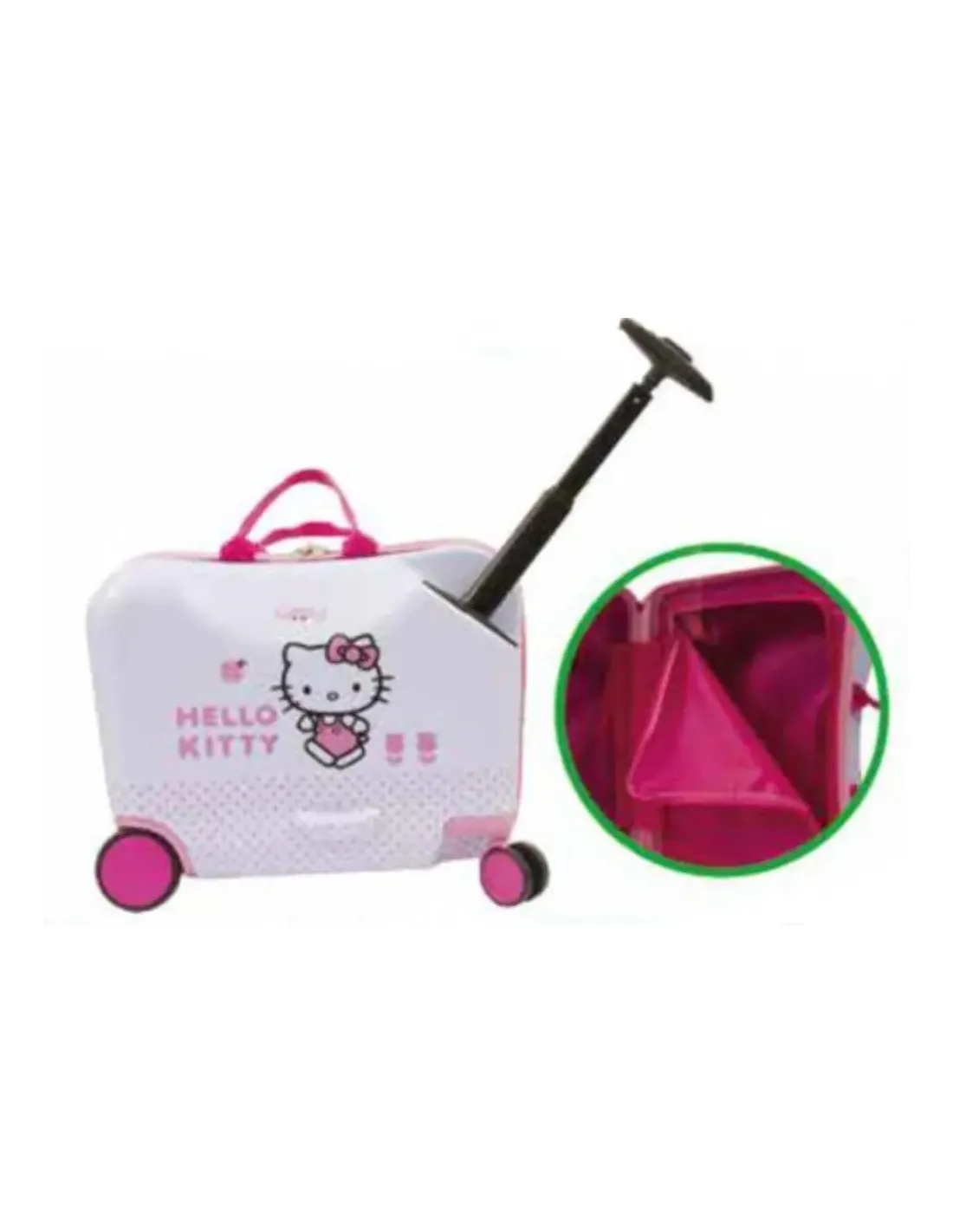 Robusto trolley cavalcabile, ha un maniglione telescopico a scomparsa per trainare la valigia con la bimba a cavalcioni. Dotato di una cinghia removibile per il trasporto a spalla da parte di un adulto. Gli interni sono completamente foderati, un lato è chiuso da una zip, l'altro lato presenta cinghie elastiche incrociate.