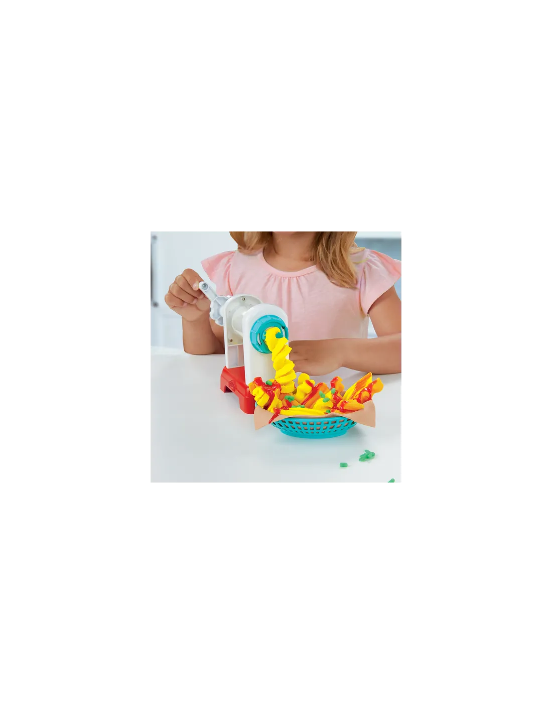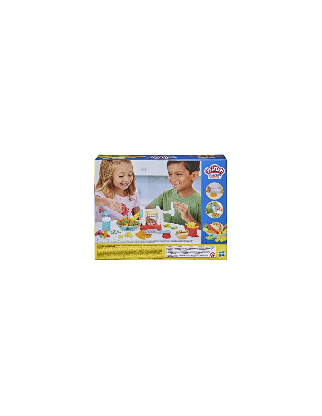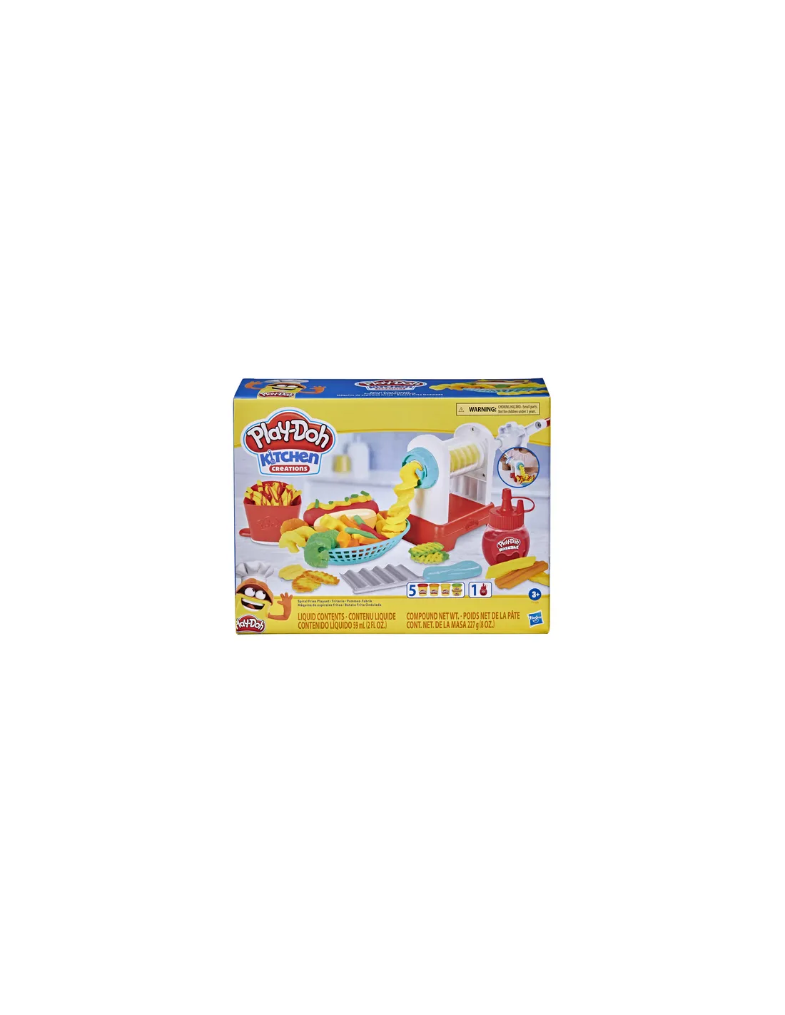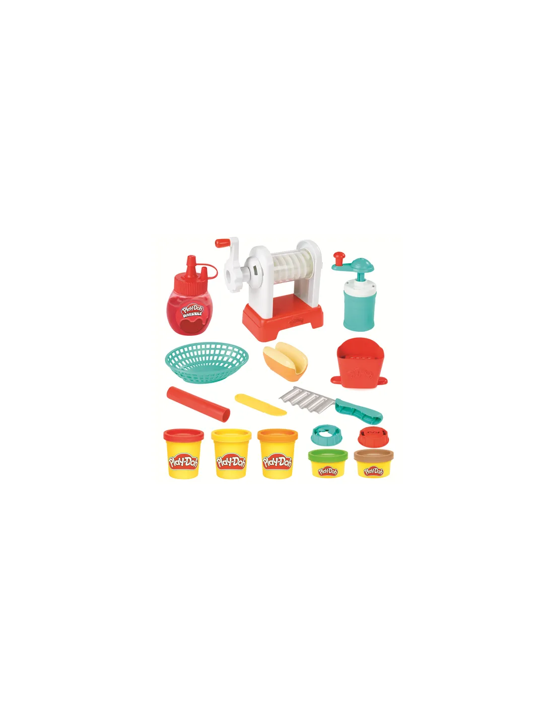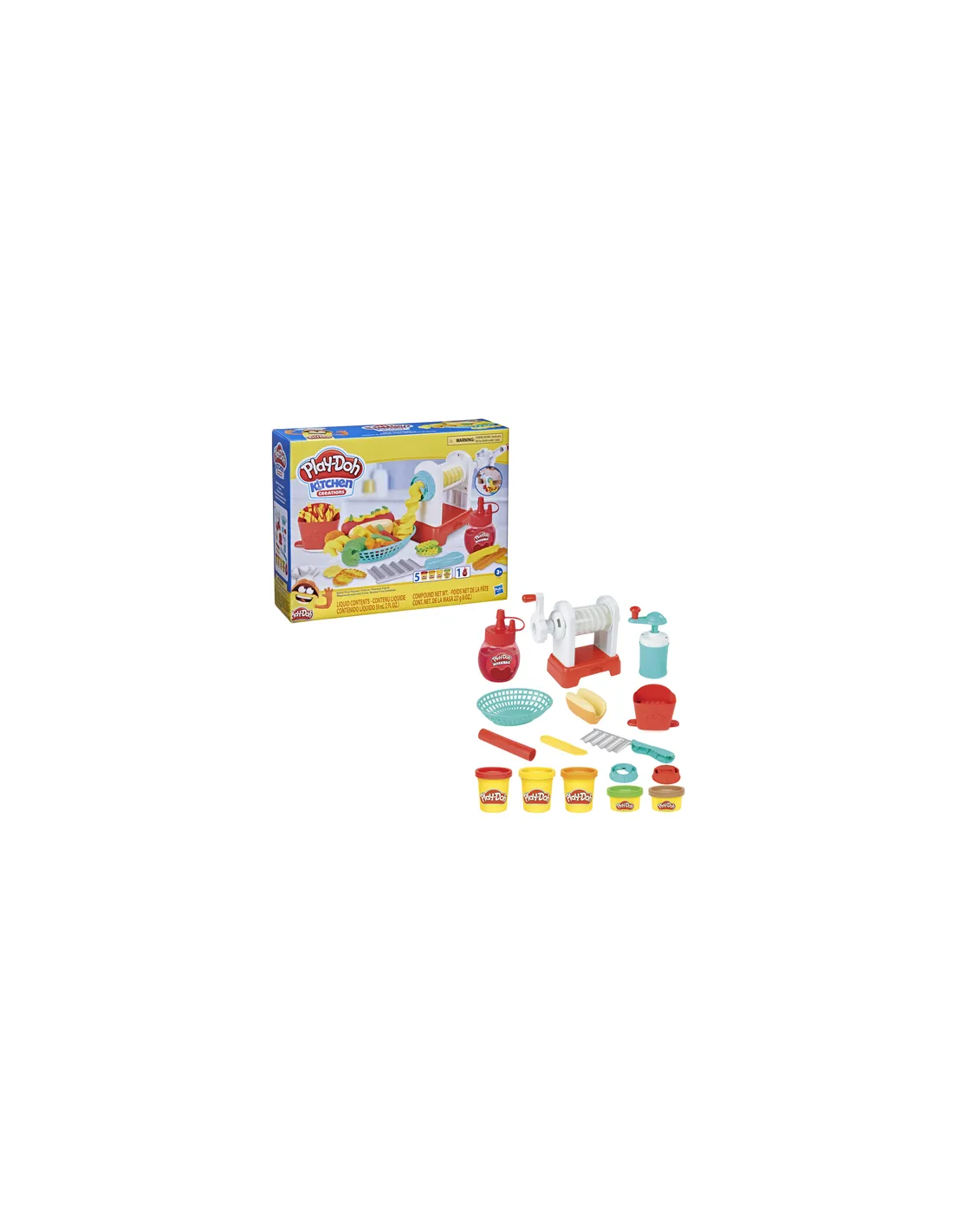 Patatine arrotolate, ondulate, dritte o verdure finte: tutte le patatine Play-Doh sono le benvenute nel modo di Play-Doh Kitchen Creations! La friggitrice giocattolo ha 2 attacchi diversi per attorcigliare e arricciare la pasta da modellare Play-Doh in forme a spirale od ondulate e puoi anche vedere i colori mentre passano attraverso la macchina trasparente. Schiaccia le patatine fritte con la scatola da portare via, taglia patatine arricciate con il coltello e prepara patatine in Play-Doh a forma di waffle con lo stampo. Quindi, decora le creazioni con le guarnizioni finte! Spremi un po' di ketchup o salsa piccante con la bottiglia rossa di Play-Doh Drizzle e guarnisci con sale ed erbette finte con il macinatore. Fai un ordine combo con un hot dog in Play-Doh da mettere sul panino di plastica. Questo set per bambini dai 3 anni in su è dotato anche di 5 colori di Play-Doh per iniziare a giocare.
