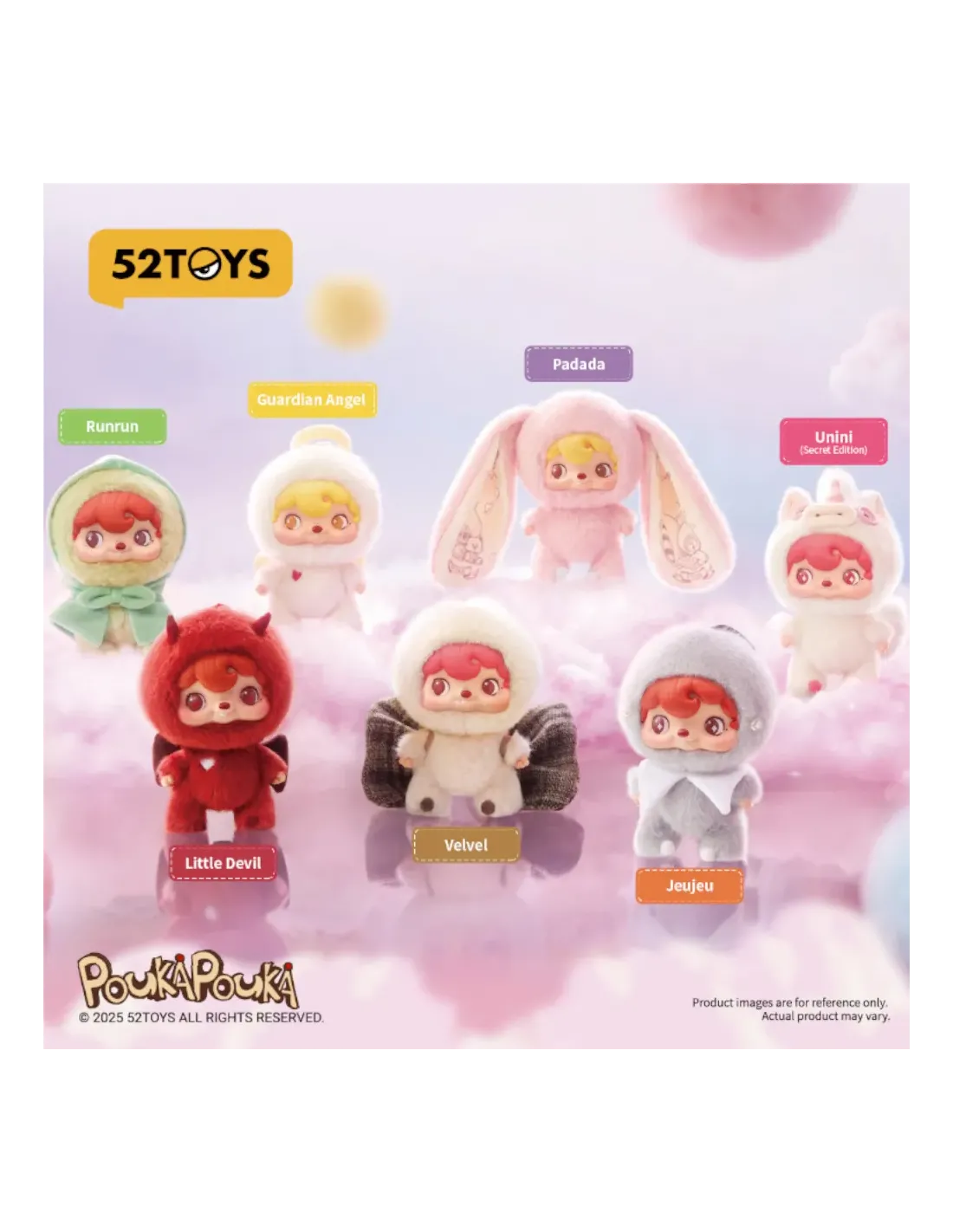 Set composto da mamma, bambino, bambina e papà panda; vestiti nei loro abiti eleganti: la mamma infatti indossa un vestito rosa e lilla mentre il bambino una tutina giallo chiaro. La bambina, più simile alla mamma, ha un elegante abitino rosa con un grosso medaglione al collo infine il papà ha una tuta lilla e verde.