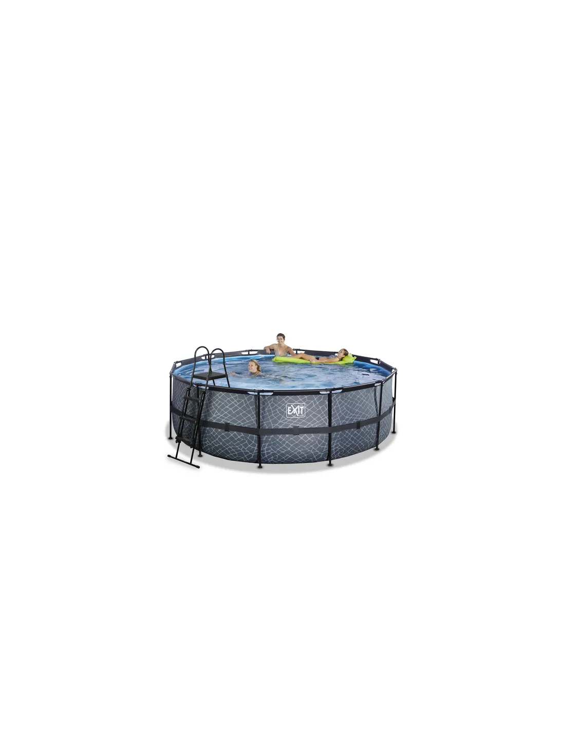 EXIT Stone pool ø427x122cm with sand filter pump - grey. Tipo di piscina: Piscina con bordi, Forma: Piscina rotonda, Capacità: 14758 L. Capacità di filtraggio: 3028 l/h, Potenza della pompa: 70 W, Voltaggio della pompa: 12 V. Materiale della struttura della scala: Metallo, Materiale del gradino della scala: Plastica, Colore della scala: Nero. Altezza: 1220 mm, Diametro: 4,27 m, Spessore della gamba: 1 mm. Materiale del rivestimento della piscina: PVC, Colore dell'incamiciatura della piscina: Grigio