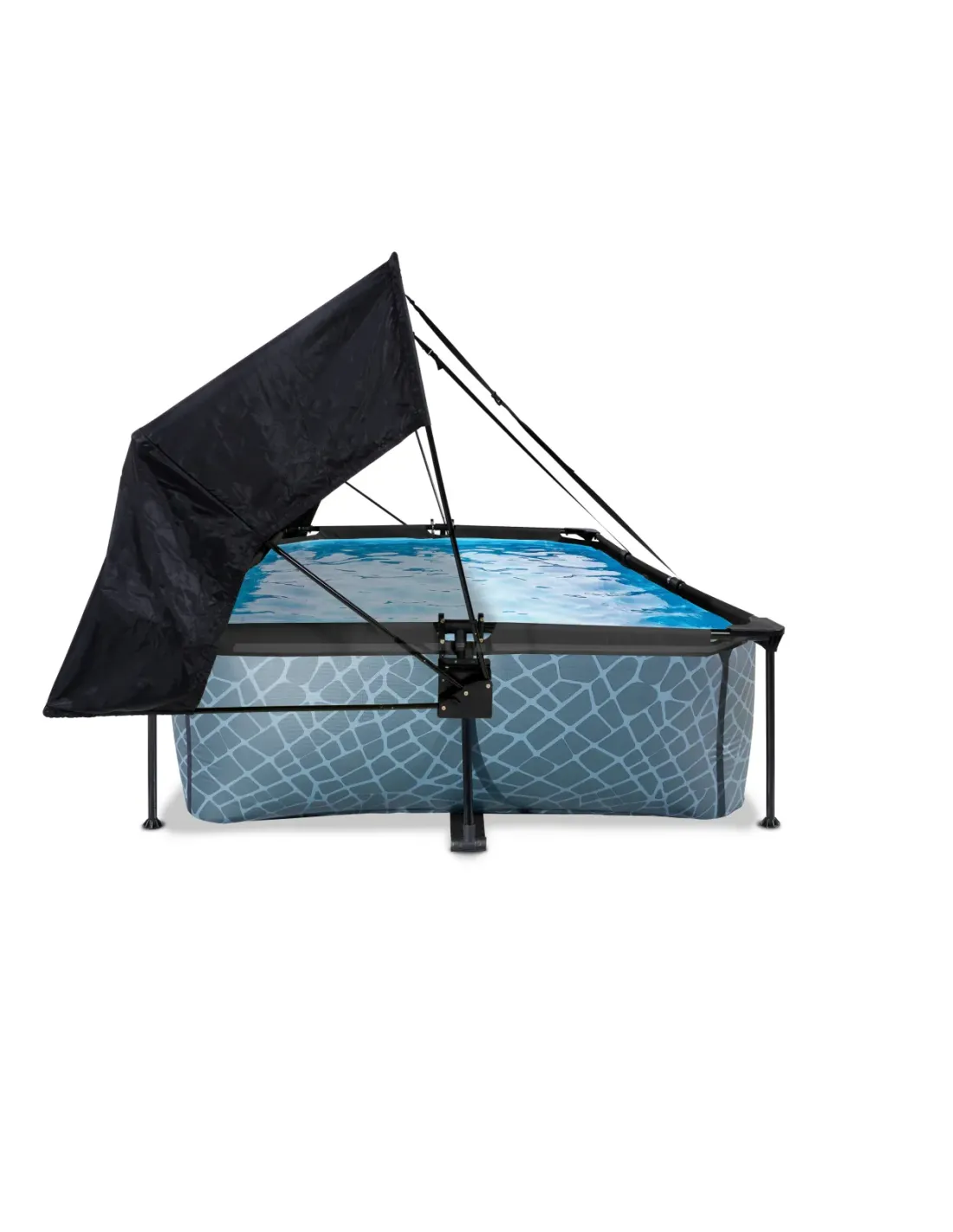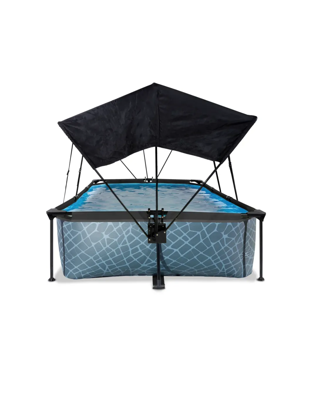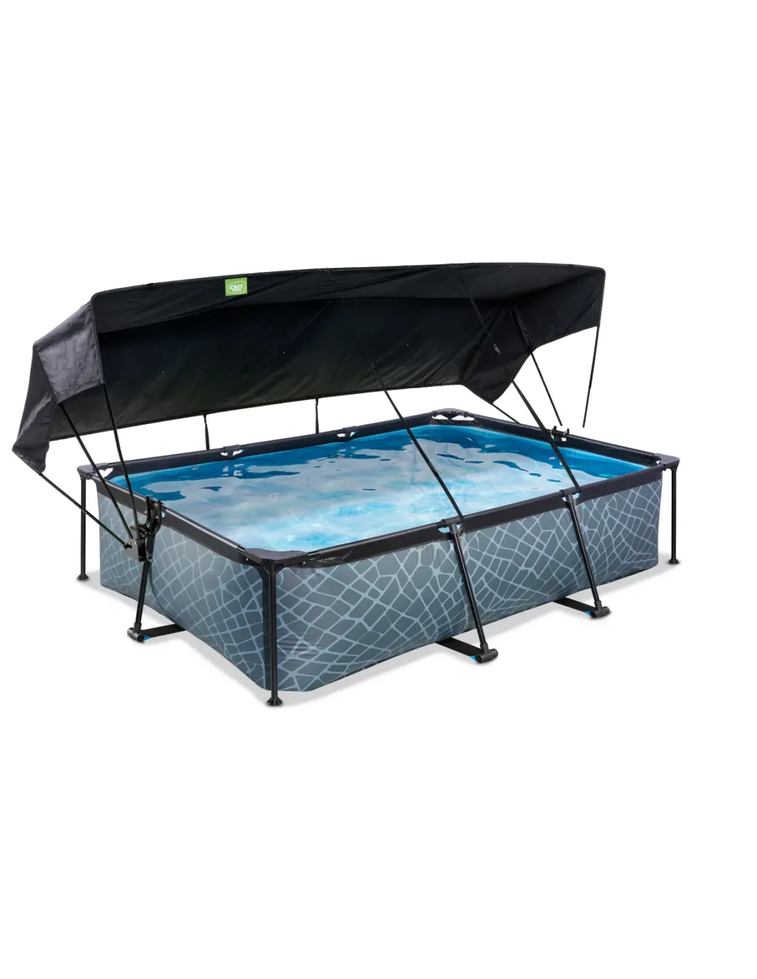La piscina EXIT Stone 300 x 200 x 65 cm è una piscina rettangolare con struttura di colore grigio. La piscina compatta contiene una pompa filtrante e una tettoia, che vi proteggerà dal sole in estate. Scopri quanto può essere robusta una piscina rettangolare fuori terra: la struttura in acciaio verniciato a polvere e gli angoli robusti della piscina EXIT Stone assicurano che la piscina rimanga sempre stabile e duri per anni. La pompa inclusa rinfresca l'acqua e la mantiene in movimento per evitare che diventi inquinata. L'esclusivo baldacchino di EXIT Toys offre una protezione ottimale dal sole. Grazie al meccanismo di piegatura user-friendly creerai ombra parziale o totale nella tua piscina in pochissimo tempo, in modo che anche quando il sole è molto luminoso puoi comunque nuotare senza problemi. Le fasce regolabili consentono di spostare il baldacchino insieme al sole e fissarlo a qualsiasi altezza desiderata. Il baldacchino ha un elegante design nero con una finitura di alta qualità. Una piscina unica con un motivo in pietra fresca e una cornice nera e con il suo aspetto naturale, la piscina in pietra si fonde perfettamente con il tuo giardino. L'interno della piscina è blu, in modo che abbia ancora quella rinfrescante sensazione di piscina. La cornice bassa della piscina permette anche ai più piccoli di accedervi con facilità.