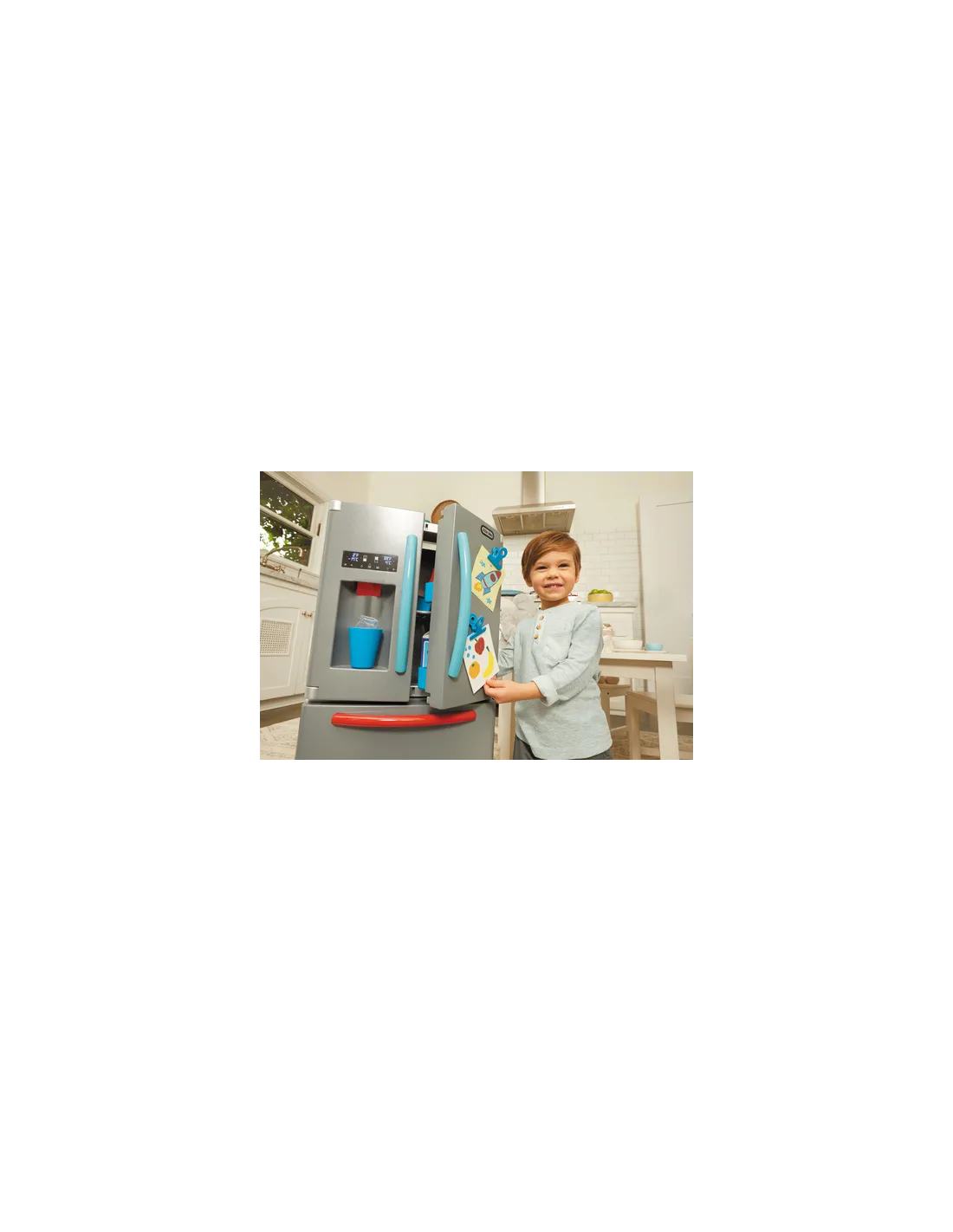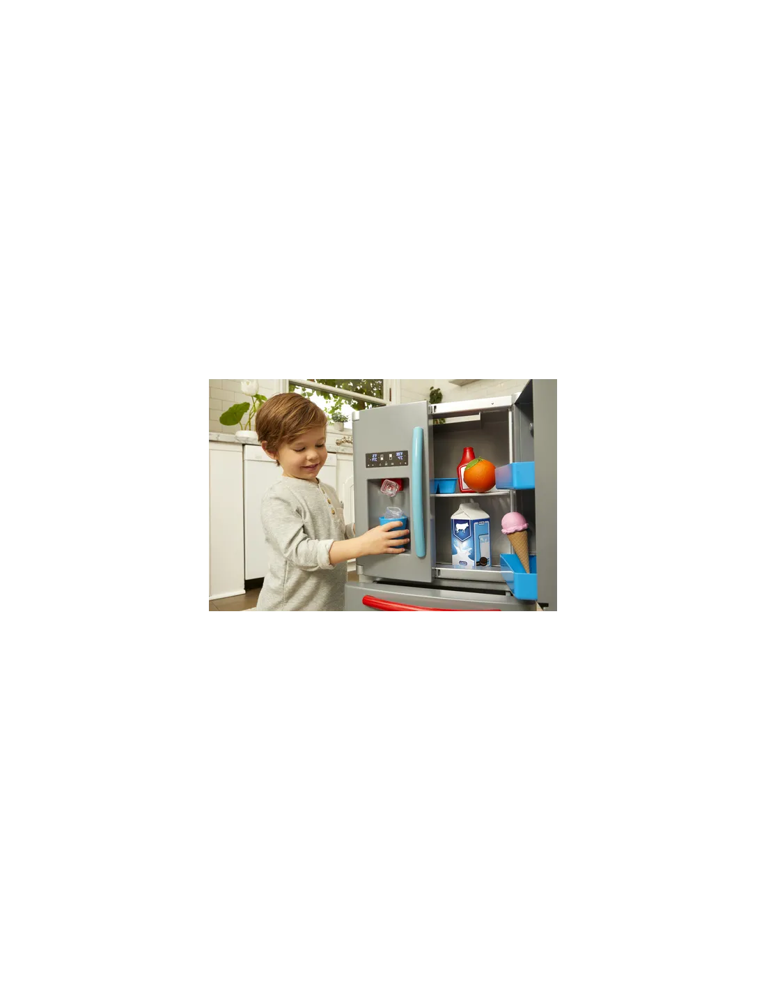 Il frigo è in stile anni '60, di un bianco panna; al suo interno ci sono tanti cibi gustosi.. dal burro per fare deliziose torte alla verdura per preparare pietanze saporite. E poi immancabile c'è lei: mamma coniglio cioccolato con il suo abito e grembiule a pois che è un indumento utilissimo in cucina per chi, come lei, deve cucinare per tutta la famiglia.