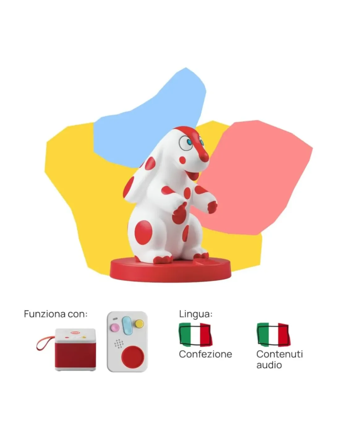 La mucca Lola ed altre simpatiche canzoncine da ascoltare ed imparare per ballare e divertirsi con i piccoli! Posiziona il personaggio sonoro sopra la cassa audio per ascoltare il tuo contenuto preferito. La durata delle storie è di 30 minuti, scarica i testi: La Mucca Lola, Cinque Ranocchi, Oh che Bel Castello, Una casetta Piccola e tanti altri.
