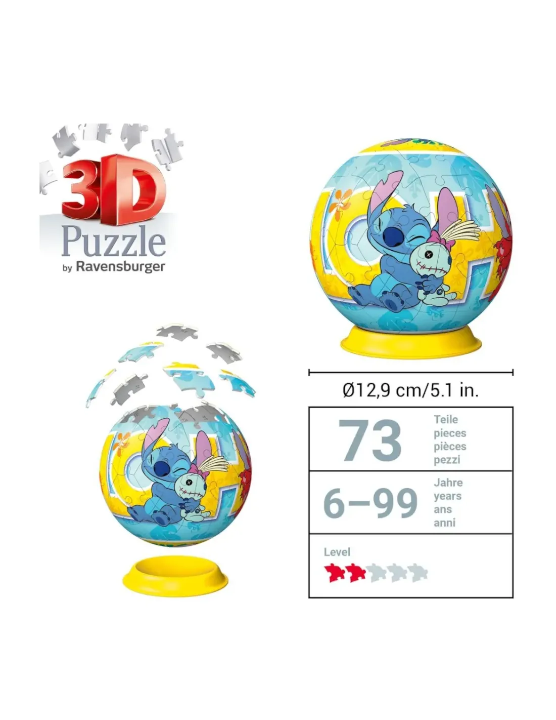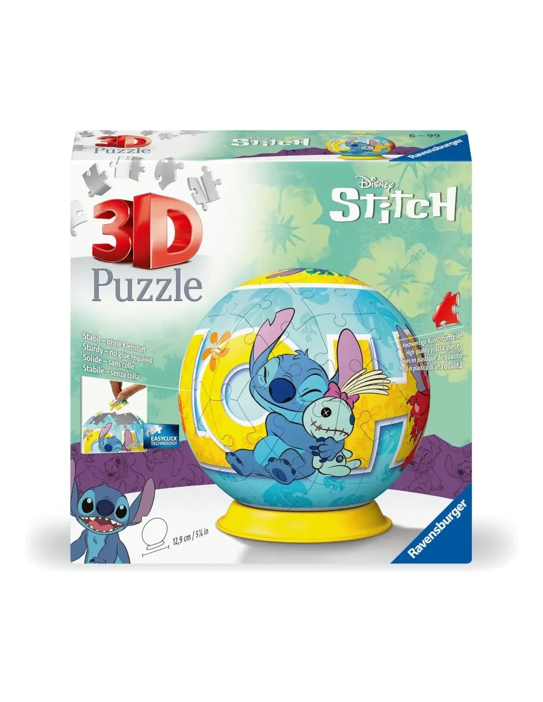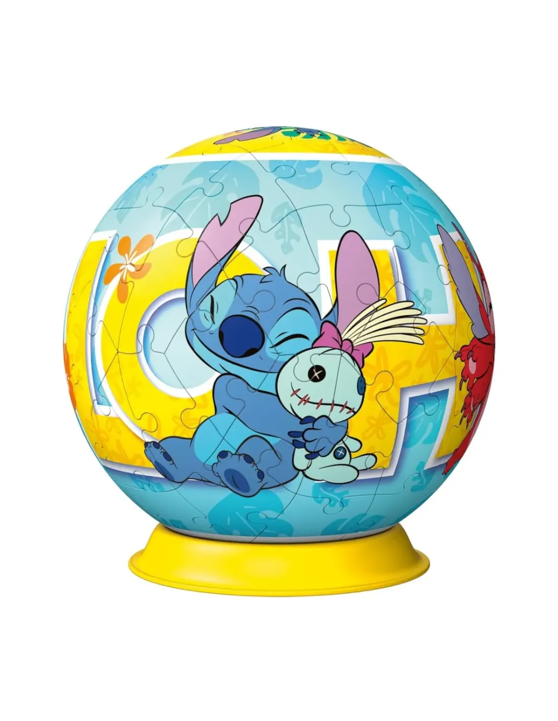 Questa Puzzle-Ball da 72 pezzi rappresenta il tenerissimo mostriciattolo blu del film Disney "Lilo & Stitch", i pezzi si incastrano facilmente tra loro senza bisogno di colla; per orientarsi nell'assemblaggio è possibile utilizzare i numeri sul retro dei pezzi..