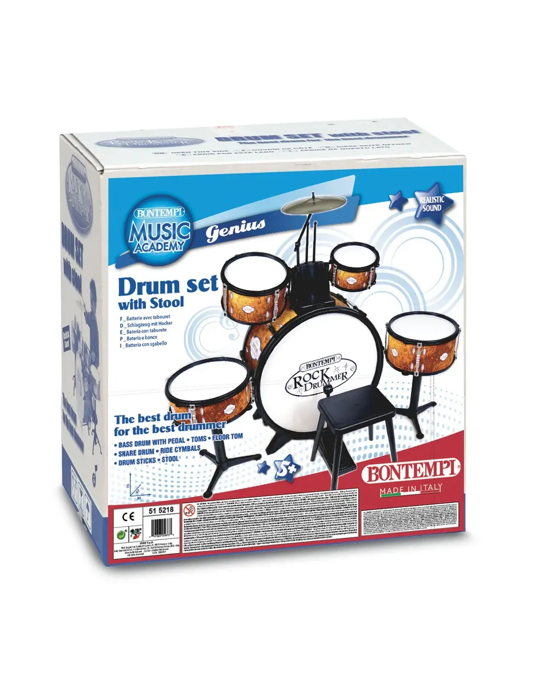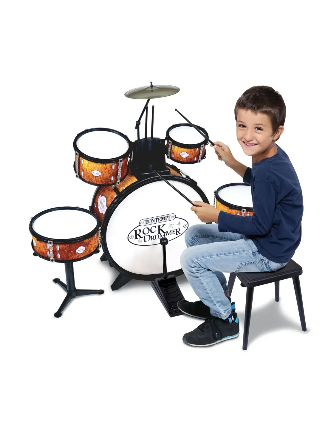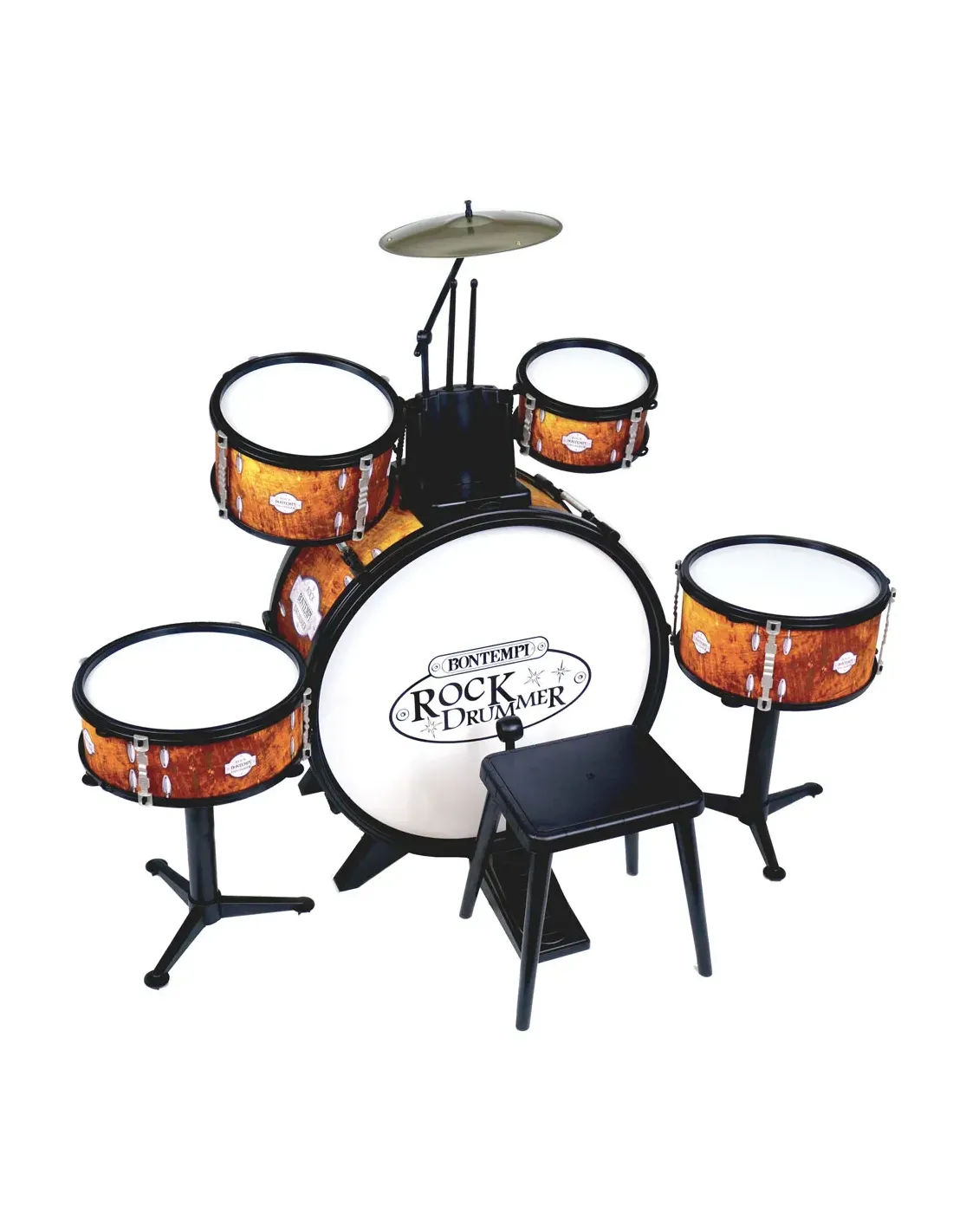 Batteria: grancassa dal diametro di 45 cm con pedale, un tamburo da 16,4 cm, un tamburo da 20,4 cm, un tamburo da 24 cm su supporto da terra, un rullante da 24 cm su supporto da terra, piatto metallico da 21 cm e 2 bacchette.. Il suono è realistico. Corredata di sgabello per un divertimento da vero batterista!