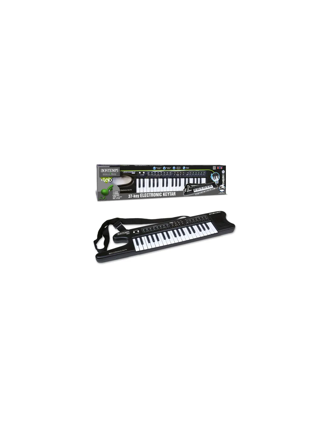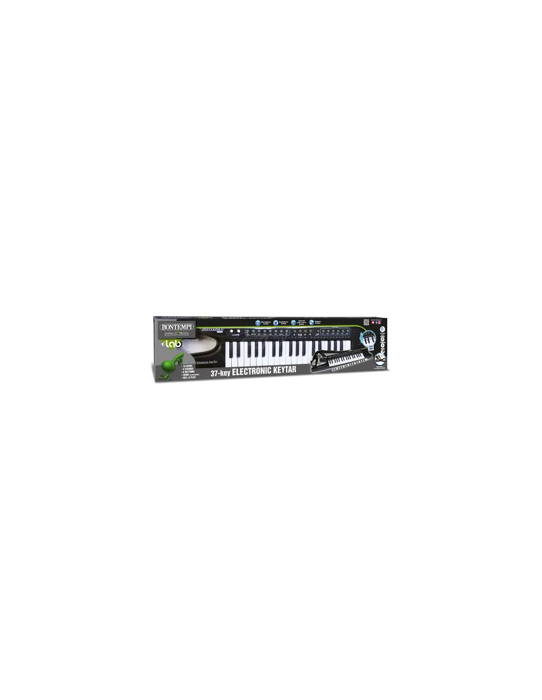 Tastiera elettronica a 37 tasti con microfono, gambe e sgabello; 7 suoni; 8 ritmi; 16 brani preregistrati; 8 ninne nanna; OKON (Funzione di apprendimento); 2 pads per suonare la batteria; regolazione del volume; regolazione del tempo e funzione di registrazione e riascolto. Presa per microfono a condensatore (incluso); presa per adattatore da rete (non...