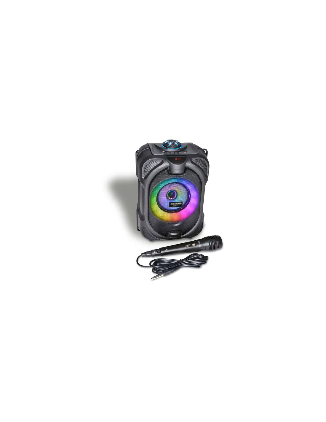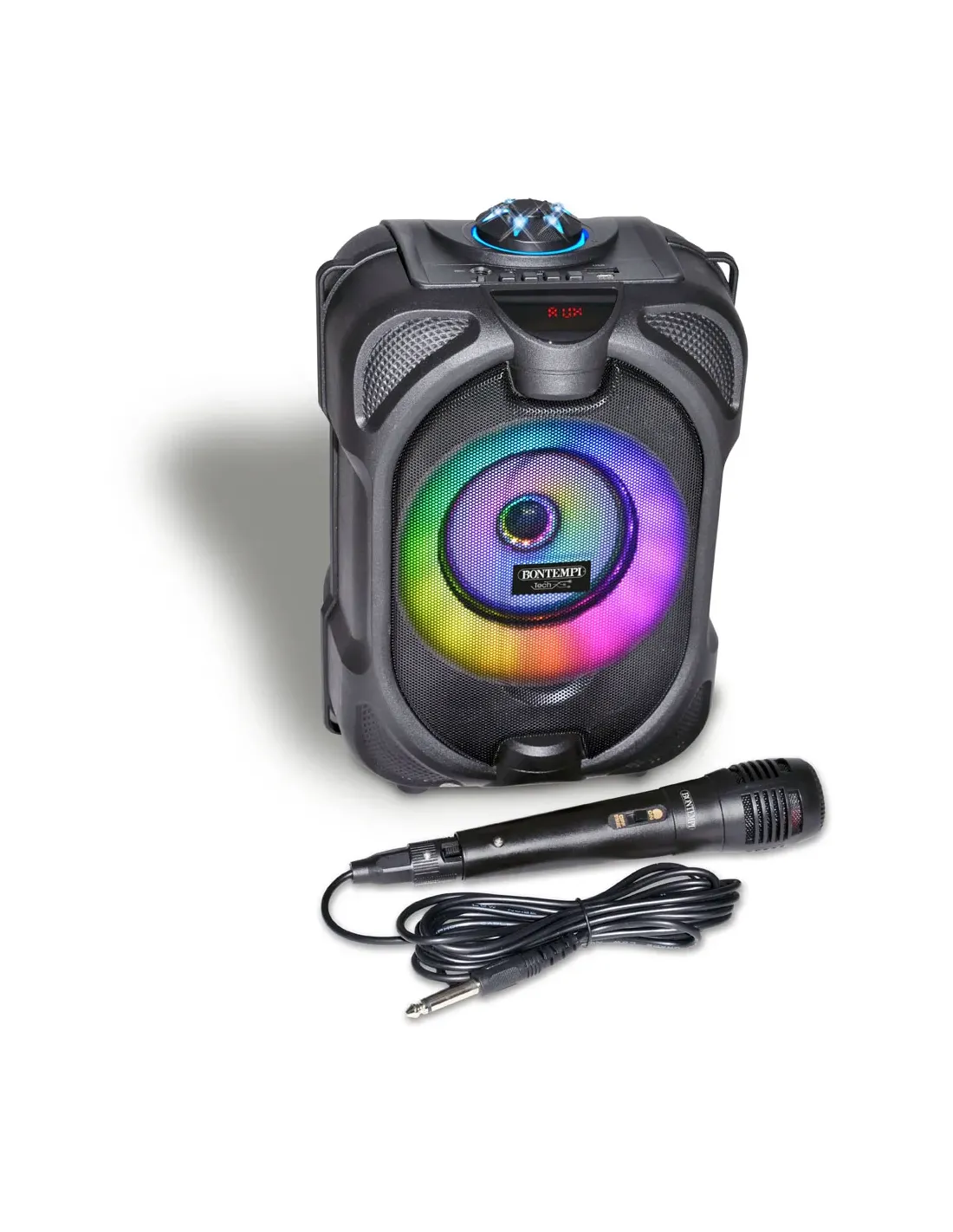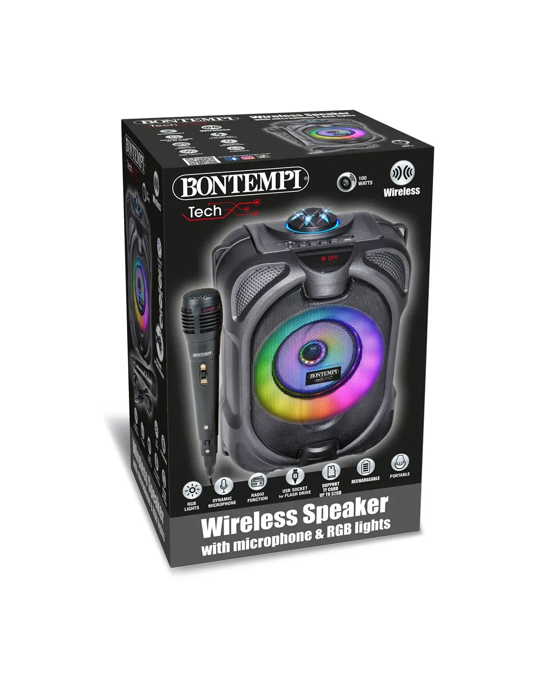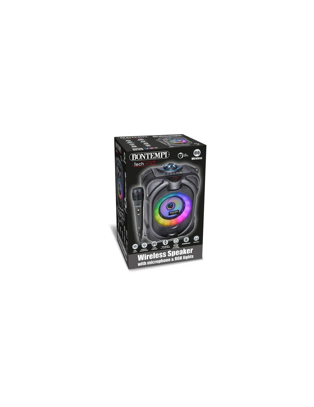 Cassa acustica wireless con microfono senza filo e luci RGB; resistente all'acqua e puoi ascoltare musica/audio: - da USB Flash Drive (non fornita); - da smartphone, tablet, PC/Laptop, ecc. (cavetto di connessione incluso); / utilizzando la connessione wireless (Bontempi491050). Funzione radio; tasto attivazione effetti luminosi; presa USB per Flash drive...