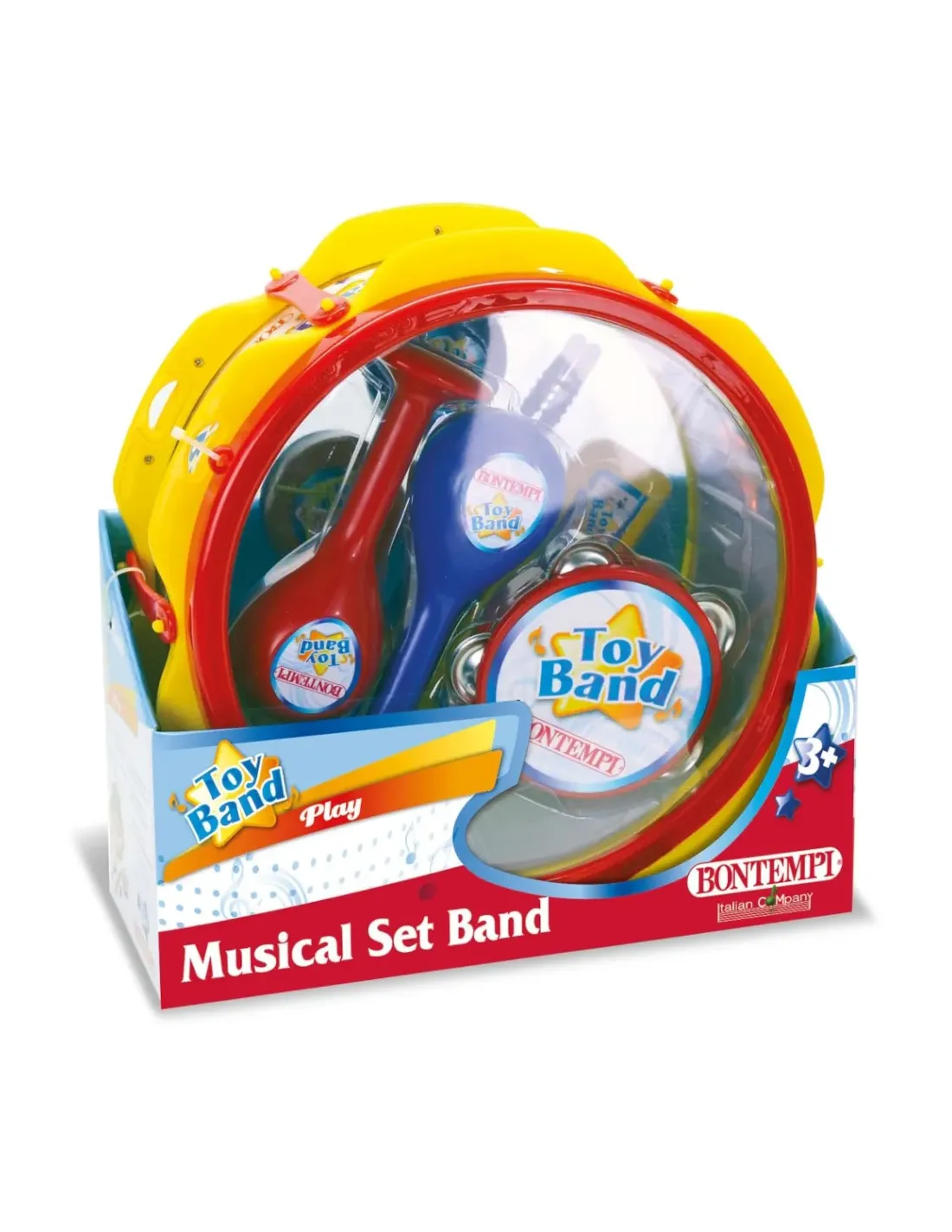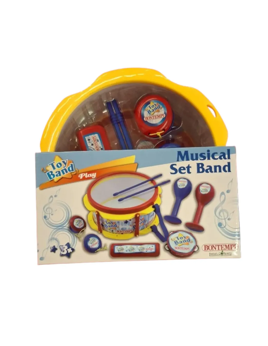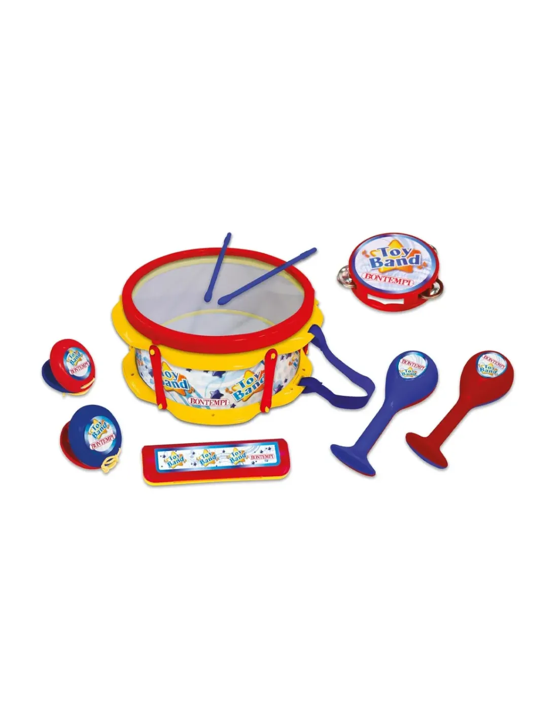 Batteria: grancassa Ø 385 mm. con pedale, 2 tamburi Ø 170 e 210 mm., Piatto metallico Ø 210 mm., 2 bacchette, Suoni realistici, Corredata di sgabello, Dim: 500x500x680 mm